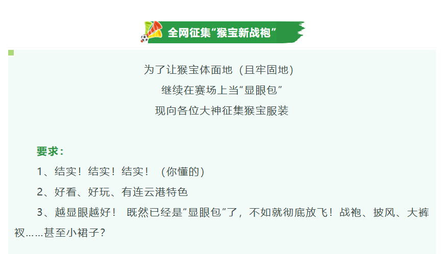 如今,“新战袍”征集已经启动,猴宝的下一段旅程即将开启。你最想看到这个“苏超显眼包”后续解锁什么新内容?是带着新战袍打卡非遗工坊,还是化身导游带火港城小众景点?这场城市IP的“逆袭之旅”,未完待续。