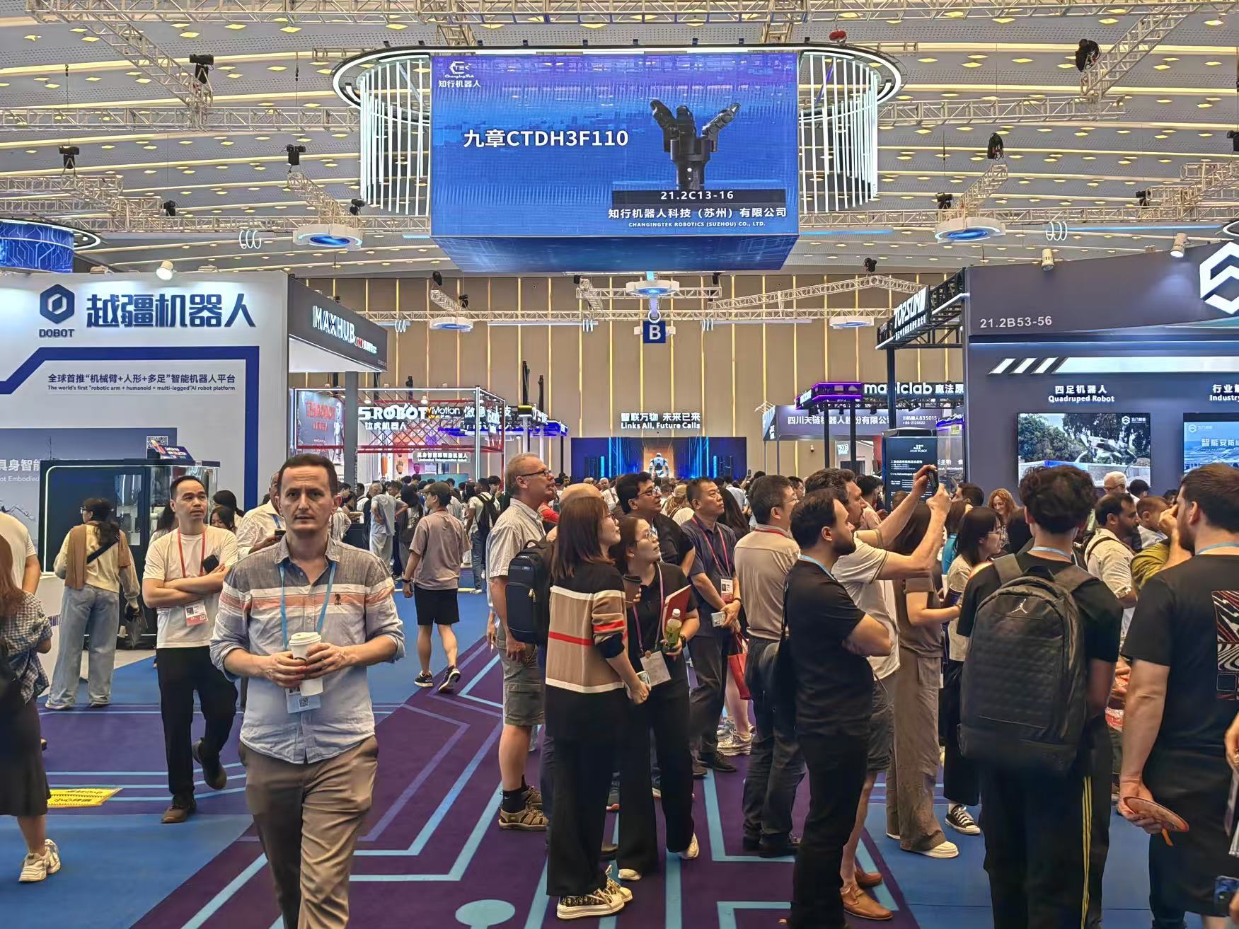 在知行机器人的展位上,人形机器人“撼岳”一出场就引起了“围观”。这款全身搭载20余个高精度驱动关节的机器人,既能扛起30公斤重物完成物流搬运,也能以亚毫米级精度执行零件装配、螺丝旋拧等精细操作。“从工厂的柔性生产、实验室的试剂处理,到商场的货物上架、园区的安防巡检,我都能胜任。”“撼岳”一边“自我介绍”,一边灵活地挥手致意,逗笑了不少围观客商,现场气氛轻松热烈,大家都抢着和它“交朋友”。