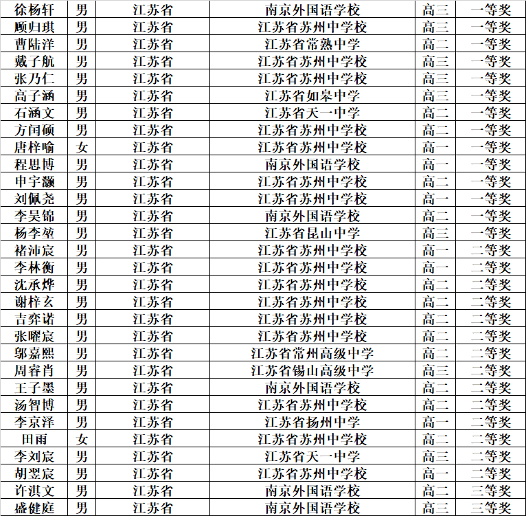 苏州中学获奖总人数第一(一、二等奖获奖人数均为第一);南京外国语学校第二;天一中学第三;常熟中学、昆山中学、如皋中学、省常中、省锡中、扬州中学各有一位同学获奖。