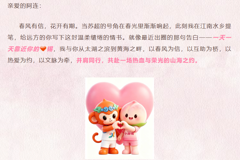 《阿连,一天一天靠近你的锡》,《心有连锡一点通》两封书信选在5:20这一浪漫节点同步发布,把“苏超”赛前氛围拉满。