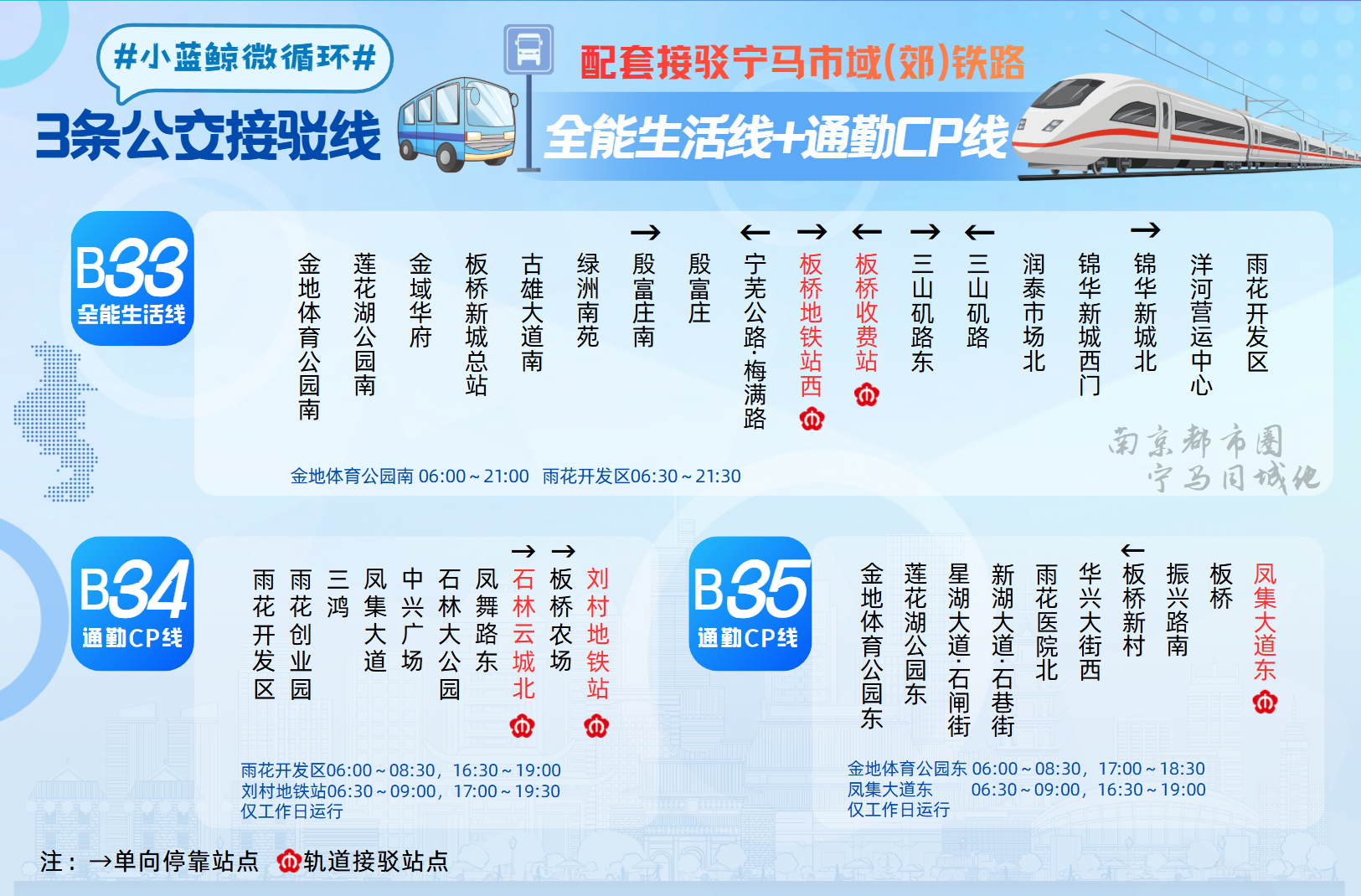 在铁路开通前,两地公交企业已进行多轮对接。南京公交规划了3条微循环接驳线并优化96路,马鞍山公交新辟和优化16条线路。B33路衔接板桥地铁站,覆盖多个大型小区、公园和创业园;B34与B35针对早晚高峰潮汐客流设计,早高峰分别承担“出站疏散”和“进站送达”功能,晚高峰对调。家住金地自在城的王女士说,现在坐接驳线15分钟左右到地铁站,比之前快了一半。