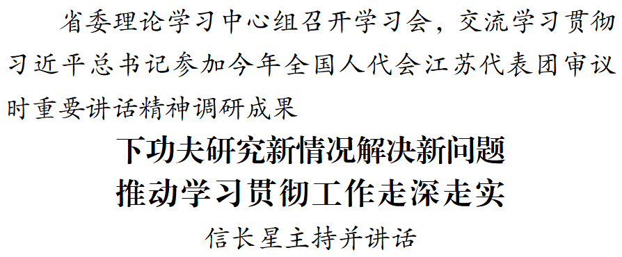 交汇点讯 4月21日,省委理论学习中心组召开学习会,交流学习贯彻习近平总书记参加今年全国人代会江苏代表团审议时重要讲话精神调研成果。省委书记信长星主持会议并讲话。