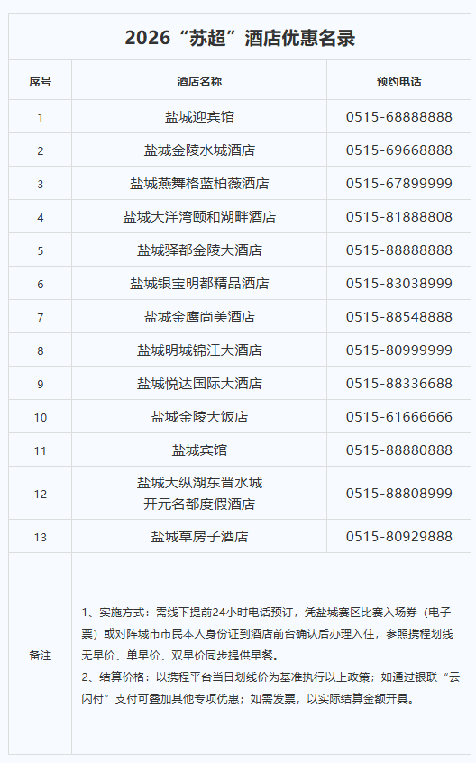 4月24日—4月26日,持盐城主场比赛入场券(电子票)的球迷,可享受盐城指定13家酒店网售平台当日划线价半价入住;宿迁市民本人入住,也可享受盐城指定酒店网售平台当日划线价八折入住。