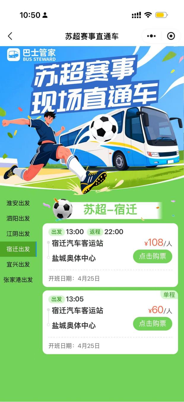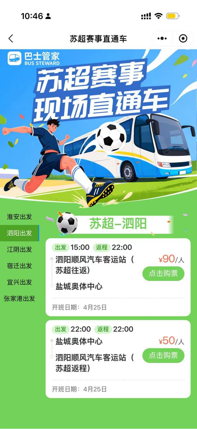 4月25日,“苏超”赛事直通车开启“宿迁汽车客运站-盐城奥体中心”“泗阳顺风企业客运站-盐城奥体中心”专线,同时还提供单程票、往返套票等多种票制,价格普惠亲民,助力球迷跨城观赛,“零中转”高效往返赛场。