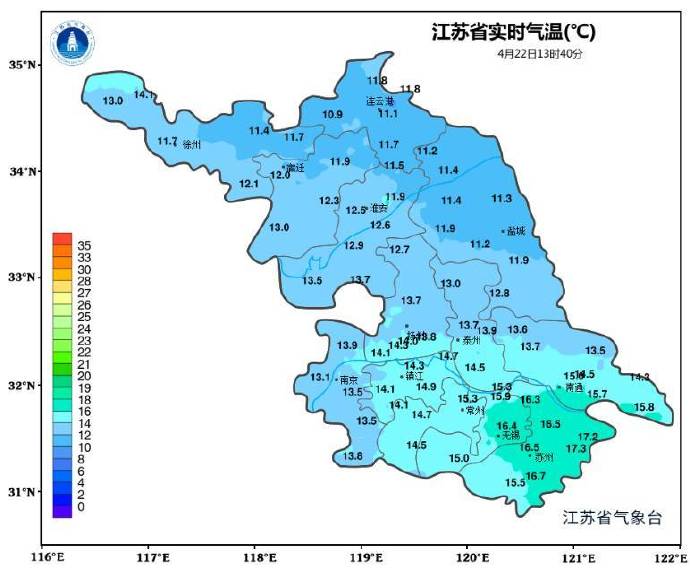 本轮降水将持续到明天白天,阴雨笼罩之下全省升温乏力,除淮安、连云港两地最高气温能达到20℃,省内其余城市最高气温均维持在十几摄氏度。