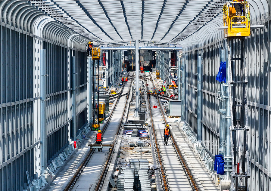 2025年3月18日,宁马城际铁路南京江宁滨江开发区段施工现场,工人正在加紧施工。方东旭 摄 视觉江苏网供图