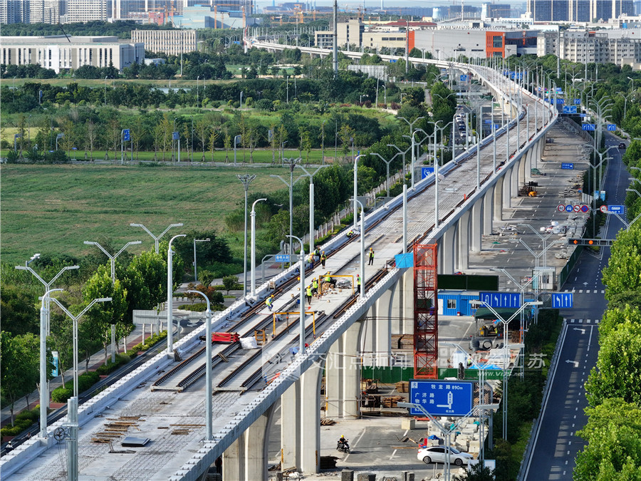 2024年7月27日,工人在宁马城际铁路南京段施工现场进行铺轨作业。方东旭 摄 视觉江苏网供图