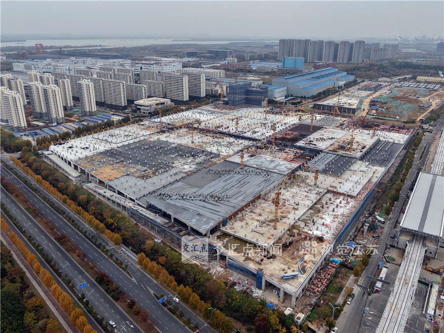 2024年12月4日,航拍宁马城际铁路(南京段)滨江车辆段项目施工现场。项目主体结构施工完成大部分,装饰装修、机电安装等二次结构施工有序进行中。新华日报·交汇点记者 宋宁 摄
