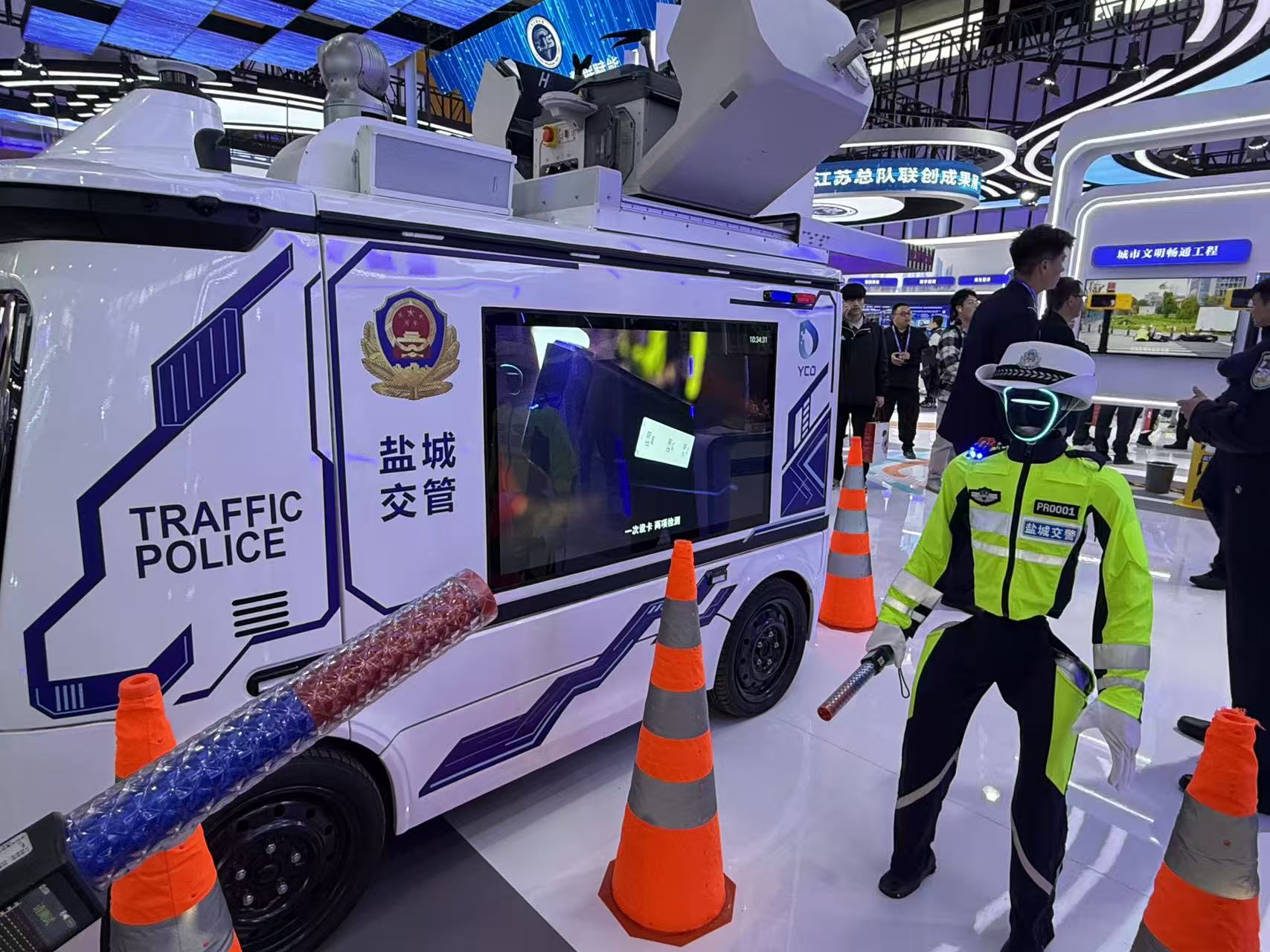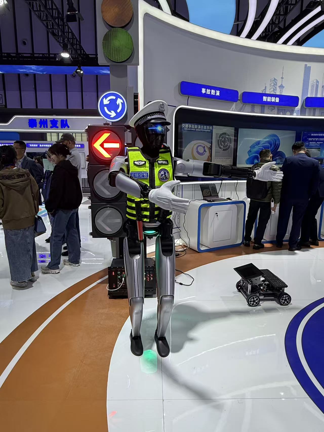 近期在网络上走红的无锡机器人交警也亮相现场。它时而打出标准的交通指挥手势,时而切换比心、点赞的互动动作,引得不少参观者排队合影。无锡市公安局交管支队交通科技大队副大队长吴天斌告诉记者,这位“网红交警”不仅能精准规范地完成指挥手势,能自动识别非机动车、行人违法行为并用语音劝导,还会化身“不下班”的服务窗口,随时解答车检、事故处理等咨询。他透露,无锡已将机器人应用拓展至特警、治安、派出所等多警种,承担排爆处置、高危现场勘察等急难险重任务,既给民警减负,更为城市安全加码。