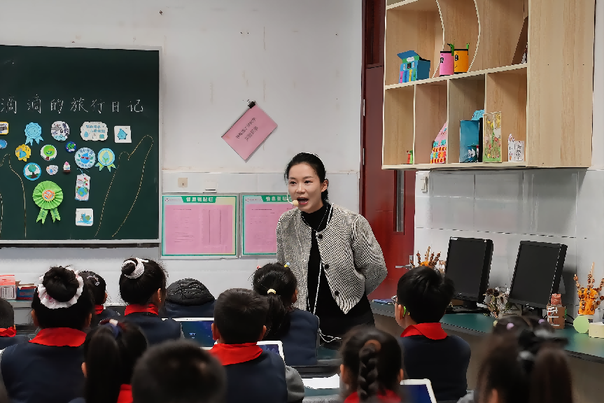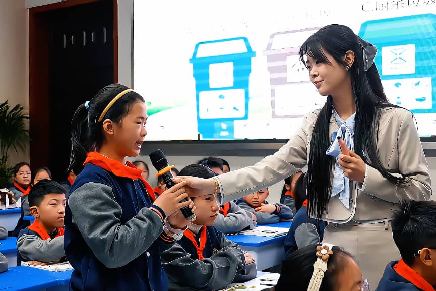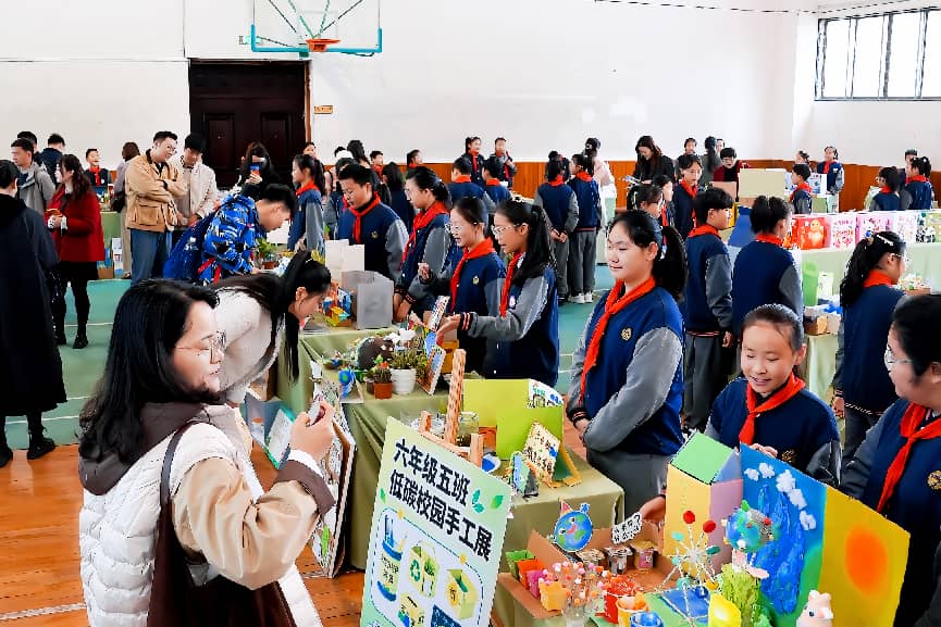 活动现场,四节生态文明跨学科展示课同步开讲:报告厅内,四年级学生探索“变废为宝”的绿色智慧;实验室里,三年级 “小小研究员”揭秘海洋污染真相;STEM 教室中,二年级孩童跟随 “滴滴”开启水资源之旅;美术室里,四年级学子用艺术与科技对话“风光互补”路灯,呈现生态教育与多学科深度融合的无限可能。