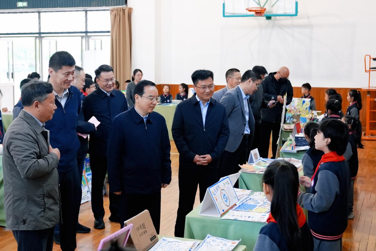 活动伊始,与会嘉宾参观全校生态文明教育成果展。建宁小学66个教学班、一至六年级全体学生均以丛书为蓝本,自主选择感兴趣的生态主题开展学习与探究,形成覆盖全学段、全员参与的生态育人格局。数字气象站、雨水回收系统、风光互补路灯等校园生态载体,搭配学生围绕 “水、土、气、生物” 创作的各类生态实践研究作品、生态手账与模型,生动呈现了“知行创合一”的育人理念,让抽象生态理念转化为可感、可触、可参与的成长体验。