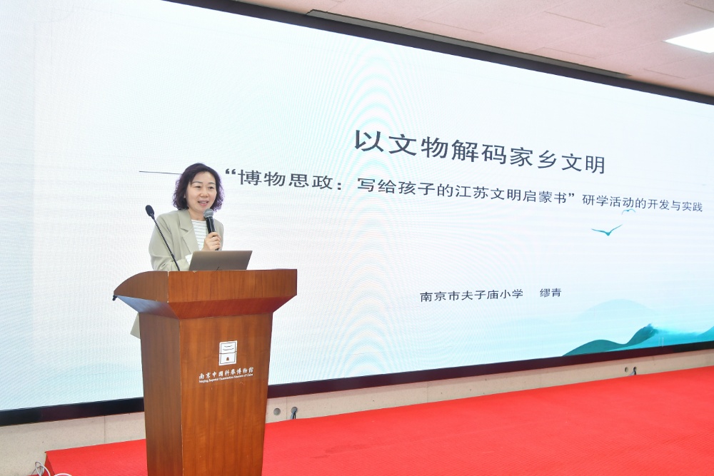 南京市夫子庙小学缪青老师分享了《以文物解码家乡文明》的实践成果。学校立足校园周边场馆优势,开发配套课程资源与学习任务,助力学生自主探究与研究性学习:在低年级开展博物馆无纸笔测评,并与南京博物院合作打造“博物思政”系列课程。馆校合作坚持课程先行,以“政治认同”为导向,精选课程资源;依托南京博物院资源,以“导学—探究”为路径,架构研学流程,通过研学单、实验、角色扮演等多元方式引导学生在真实情境中深度学习;构建家校社协同育人的“大师资”体系,让思政课堂从教室走向博物馆,从书本走向文物,帮助孩子在触摸历史中建立文化认同与民族情感。