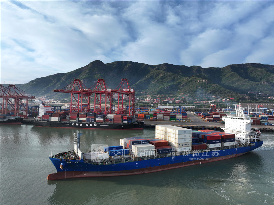 (特约摄影 王春 07:00摄 09:00上线)4月23日,在连云港港集装箱码头,货轮停在泊位装卸集装箱。一季度,全省港口累计完成货物吞吐量8.8亿吨、集装箱吞吐量729.9万标箱,同比分别增长3.7%、5.1%;累计完成外贸货物吞吐量1.7亿吨、外贸集装箱吞吐量346.1万标箱,分别同比增长4.5%、3.5%;累计完成“一箱制”集装箱铁水联运量4.1万标箱,同比增长33.3%。