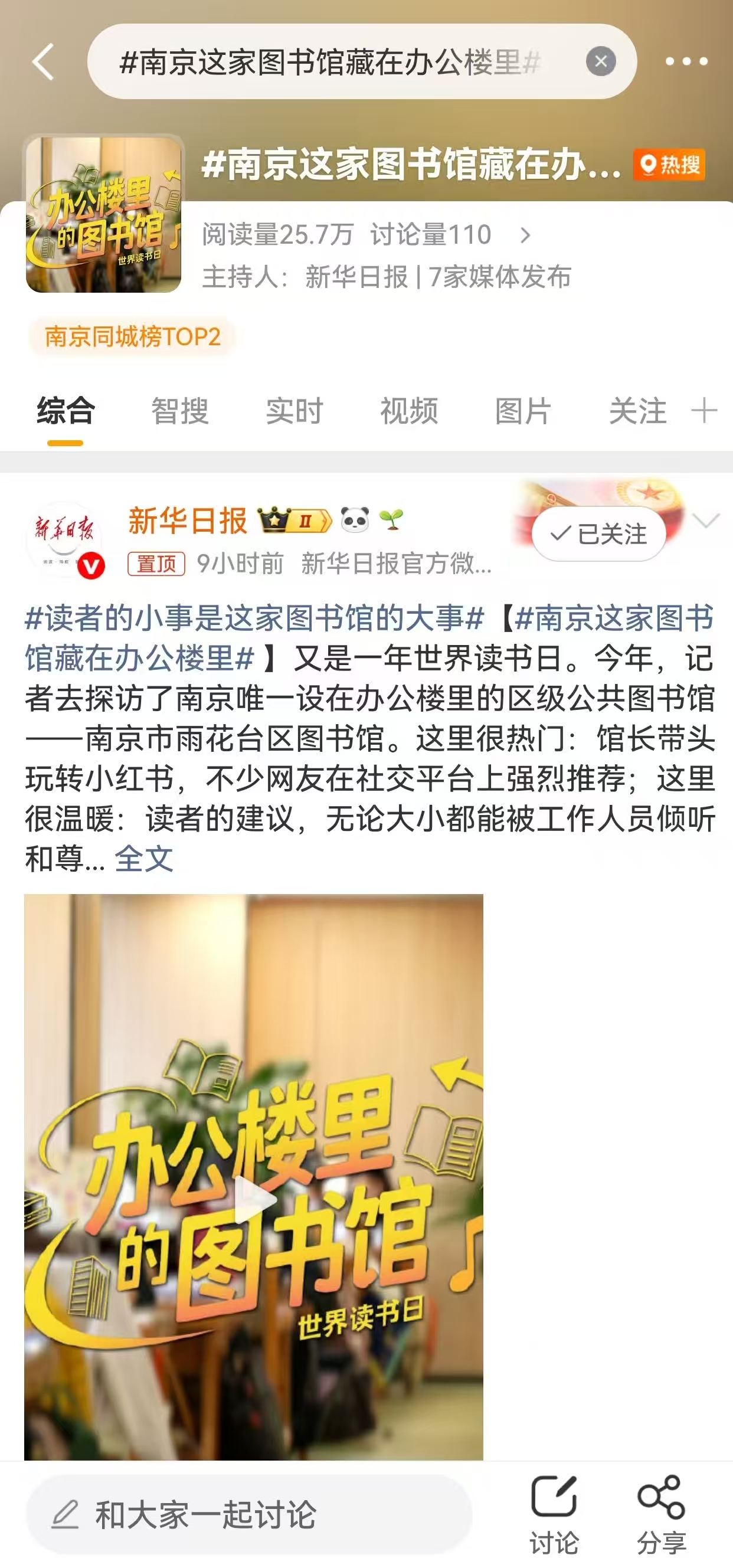 4月23日,世界读书日。新华日报交汇点新闻全平台发布短视频新闻《办公楼里的图书馆》,一经推出取得不错反响,相关话题词登上微博同城热搜。