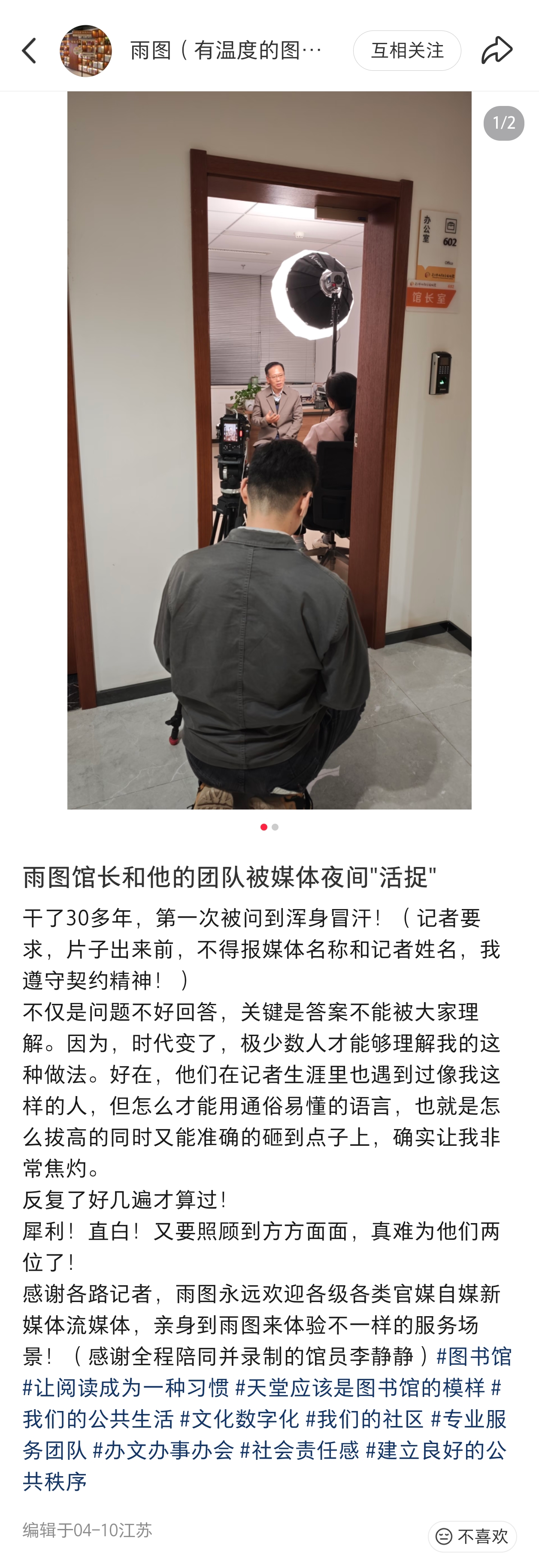 成片发布后,我收到了好多人说这条片子做得好,很鲜活。我就想起易峰说,雨图的好不是馆方自己闷头做的,是读者和我们共建共享的。今天,我才真正懂了这句话。好新闻其实也是一样的,从来不是记者坐在格子间里闷头写出来的,是和馆长、那些热情的读者、所有的采访对象,你一句我一句一起共创而成。