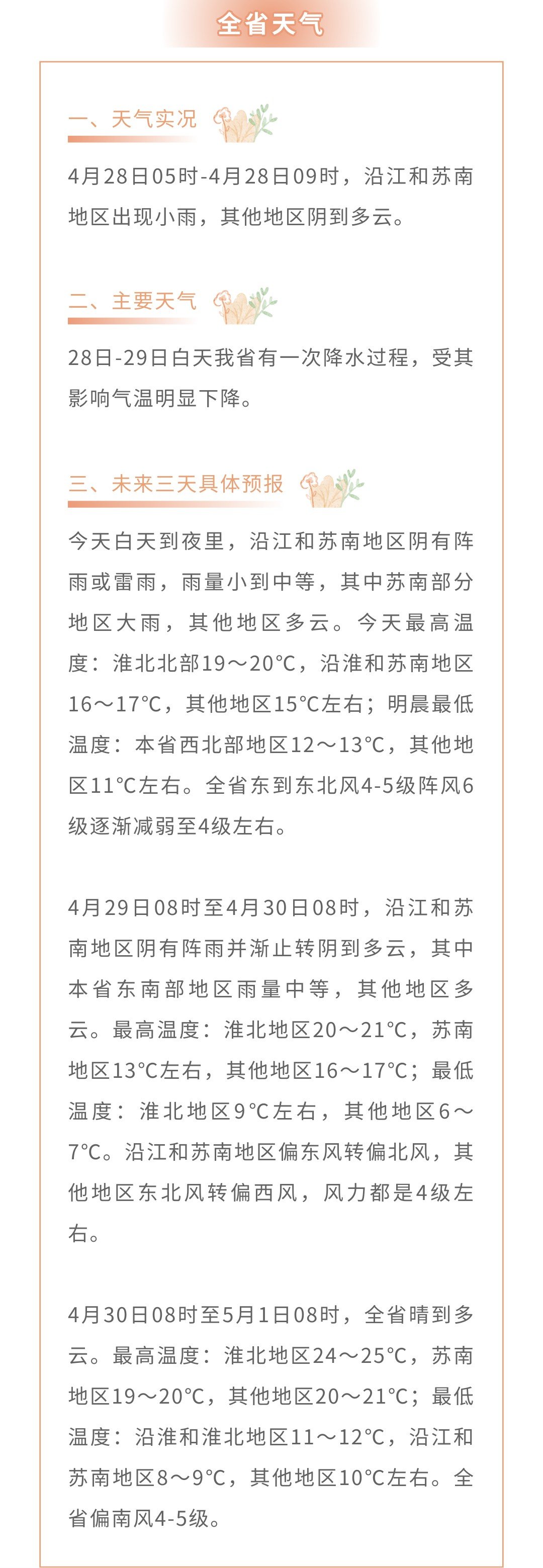 4月29日08时至4月30日08时,沿江和苏南地区阴有阵雨并渐止转阴到多云,其中本省东南部地区雨量中等,其他地区多云。最高温度:淮北地区20~21℃,苏南地区13℃左右,其他地区16~17℃;最低温度:淮北地区9℃左右,其他地区6~7℃。沿江和苏南地区偏东风转偏北风,其他地区东北风转偏西风,风力都是4级左右。