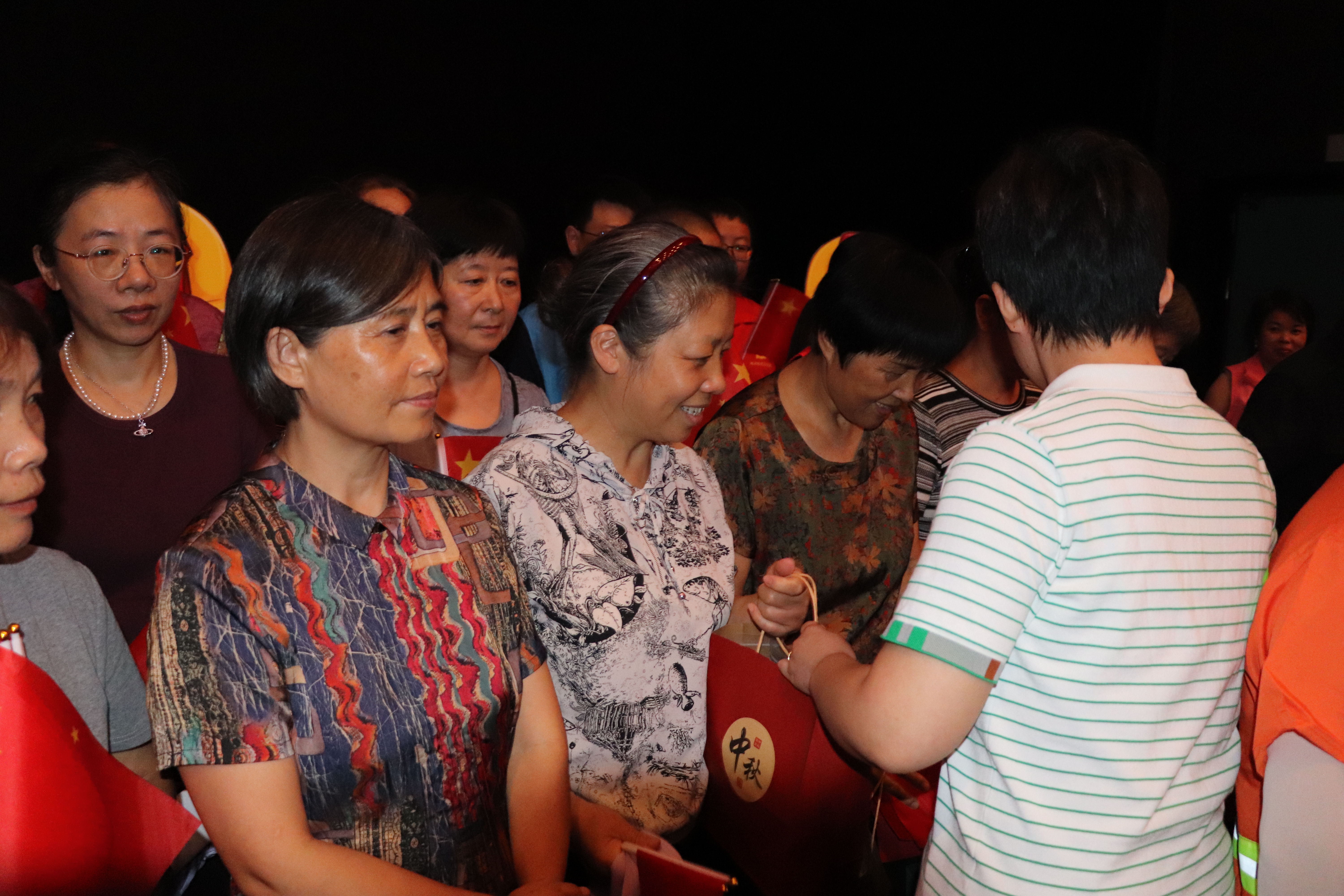为让退休职工与环卫工人代表都感受到浓浓的双节氛围,社区在细节处精准发力,让节日关怀既“适配需求”又“饱含温度”。一方面,提前定制分类中秋暖心礼包,为退休职工准备低糖麦饼、手写祝福卡与社区服务联系卡,为环卫工人增设便携杯、防晒袖套等实用物资,每一份都由工作人员亲手打包。另一方面,结合观影主题,社区向两类群体同步发放小国旗和历史资料手册,让“看电影”成为全员参与的文化学习之旅。