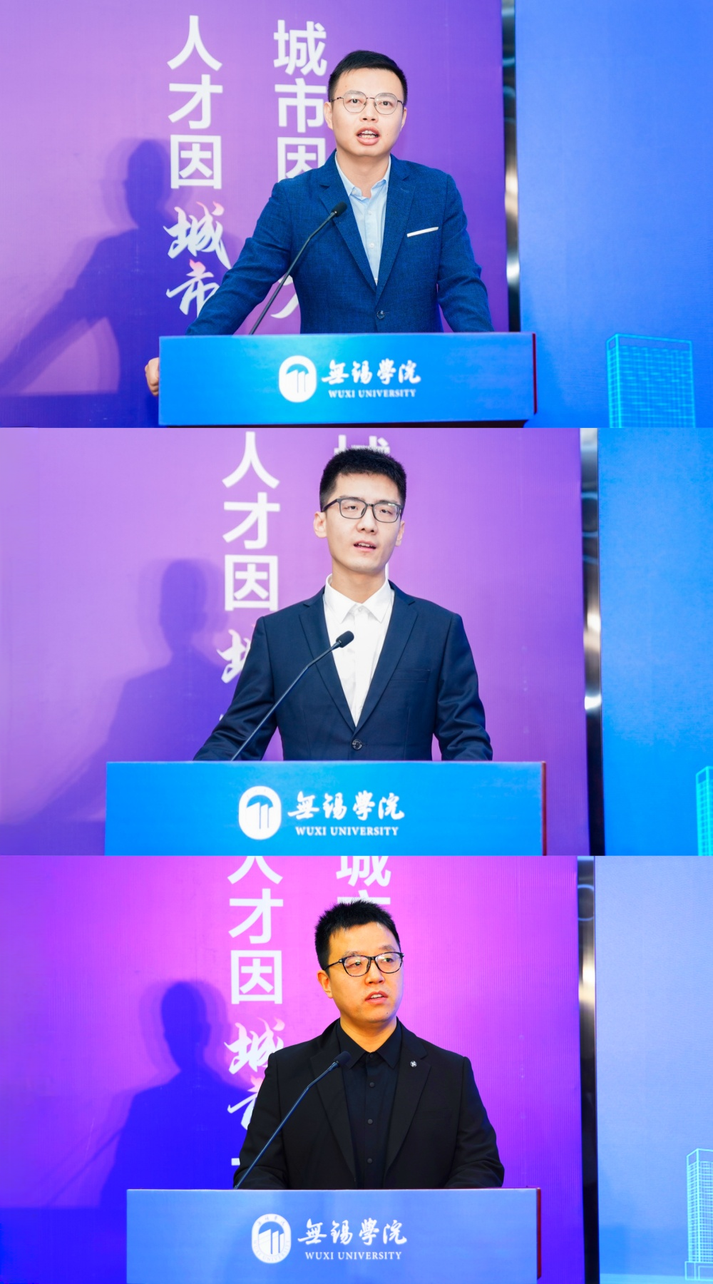 新进教师代表梅剑、李世雨、胡皓结合自身来校工作经历,分享了学校“教授直评”职称晋升绿色通道、有组织的教学科研、团队组建、人才服务等方面为青年教师的成长赋能。参会学者代表、东南大学博士付彤也分享了自己的心得感悟,正是学校与无锡人才政策的强力支持与暖心感召,让自己坚定了扎根无锡、潜心科研的决心。