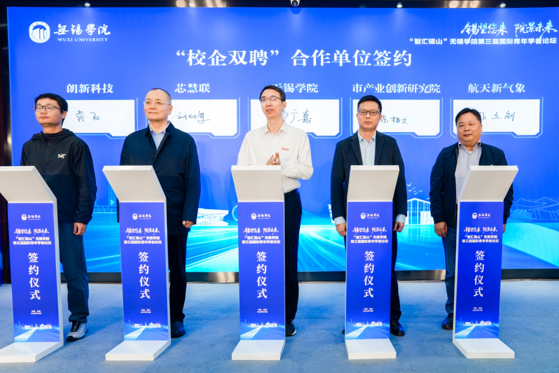 作为深化产教融合的核心举措,“校企双聘”机制通过“人才共用、成本共担、收益共享”模式,有效破解学校重点学科与紧缺学科人才瓶颈。论坛现场,学校与无锡市产业创新研究院、朗新科技集团股份有限公司、航天新气象科技有限公司、芯慧联(无锡)半导体科技有限公司等4家企事业单位签订“校企双聘”合作协议,这标志着学校“校企双聘”合作再添新伙伴,校企人才引育协同迈入新阶段。