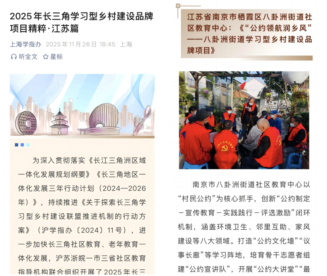 八卦洲“公约领航润乡风”入选长三角学习型乡村建设品牌项目。