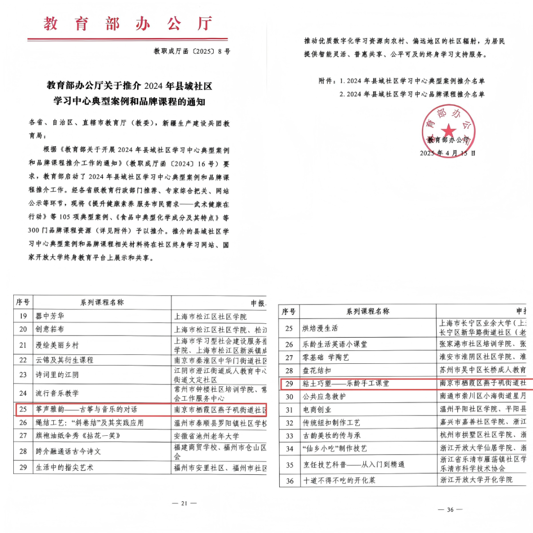 燕子矶《筝声雅韵》《粘土巧塑》入选教育部县域社区品牌课程。