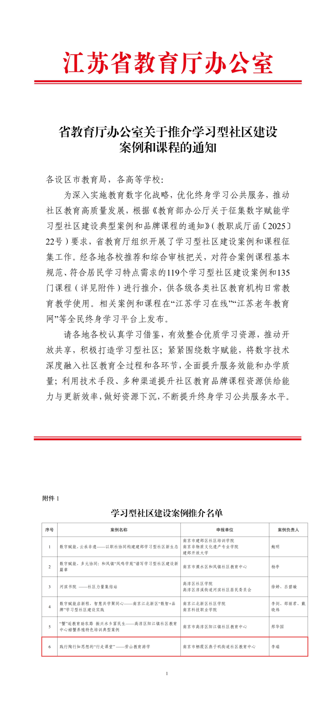 燕子矶《践行陶行知思想的“行走课堂”——劳山教育游学》入选省教育厅学习型社区建设典型案例。