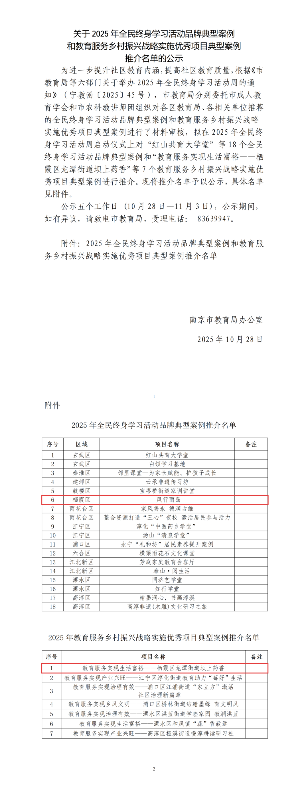 八卦洲“风行丽岛”、龙潭“坝上药香”入选市全民终身学习活动品牌及教育服务乡村振兴优秀项目。