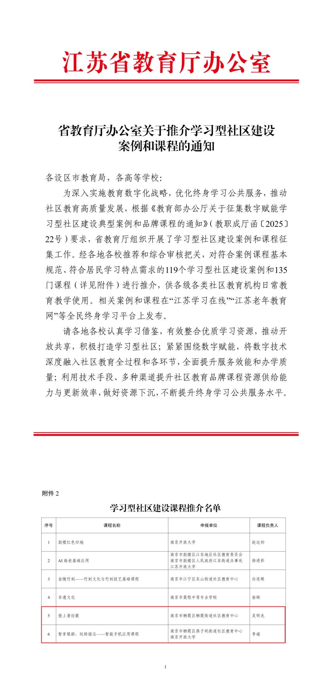 栖霞街道《垫上普拉提》、燕子矶《智享银龄智享银龄,玩转指尖——智能手机应用课程》入选省教育厅学习型社区建设品牌课程。