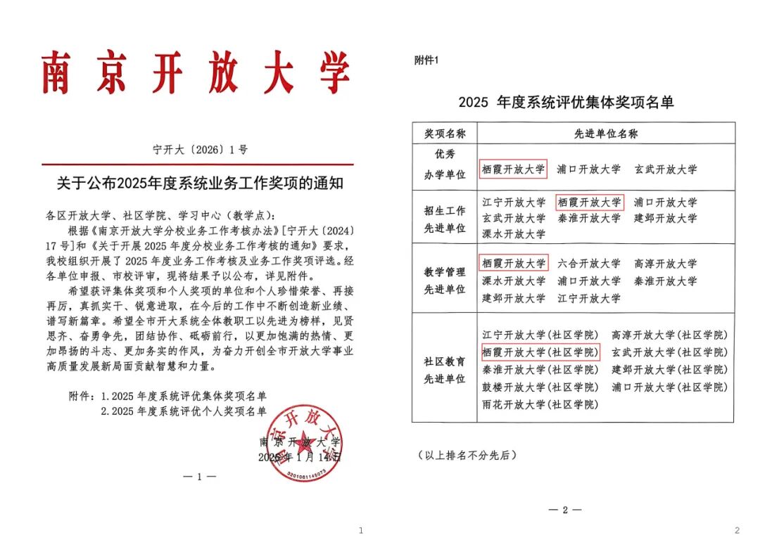 区开放大学(社区学院)获评南京开放大学系统优秀办学单位、社区教育先进单位等。