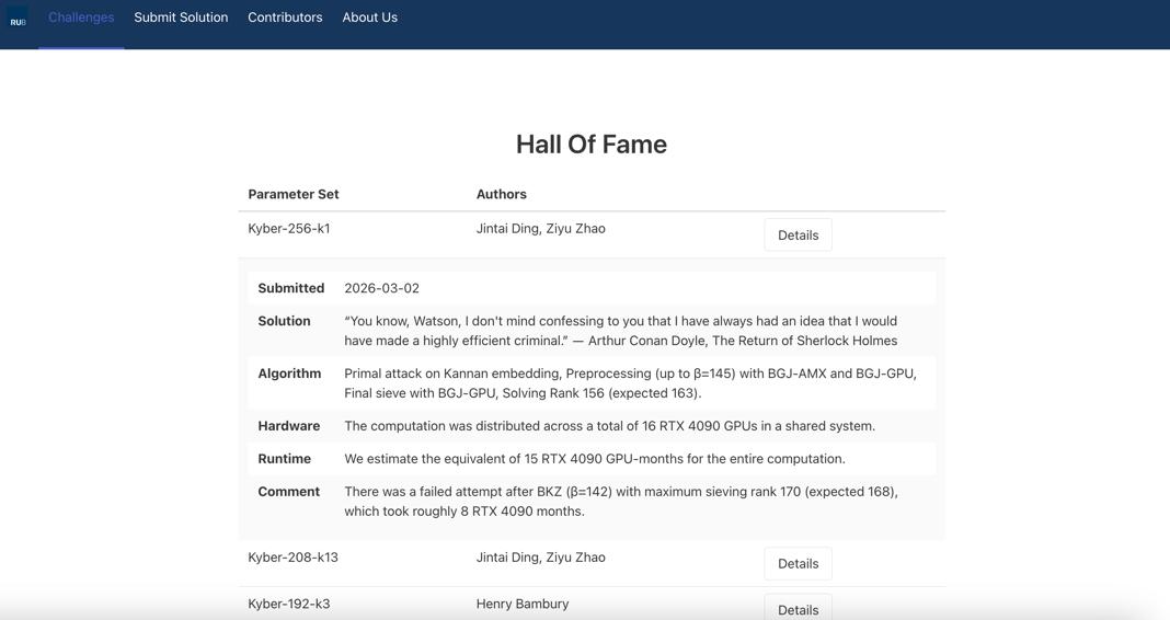 在此次破译之前,实验室团队已求解了维度 200 和 210 的最短向量问题,并完成了 Kyber 208 挑战的破译。