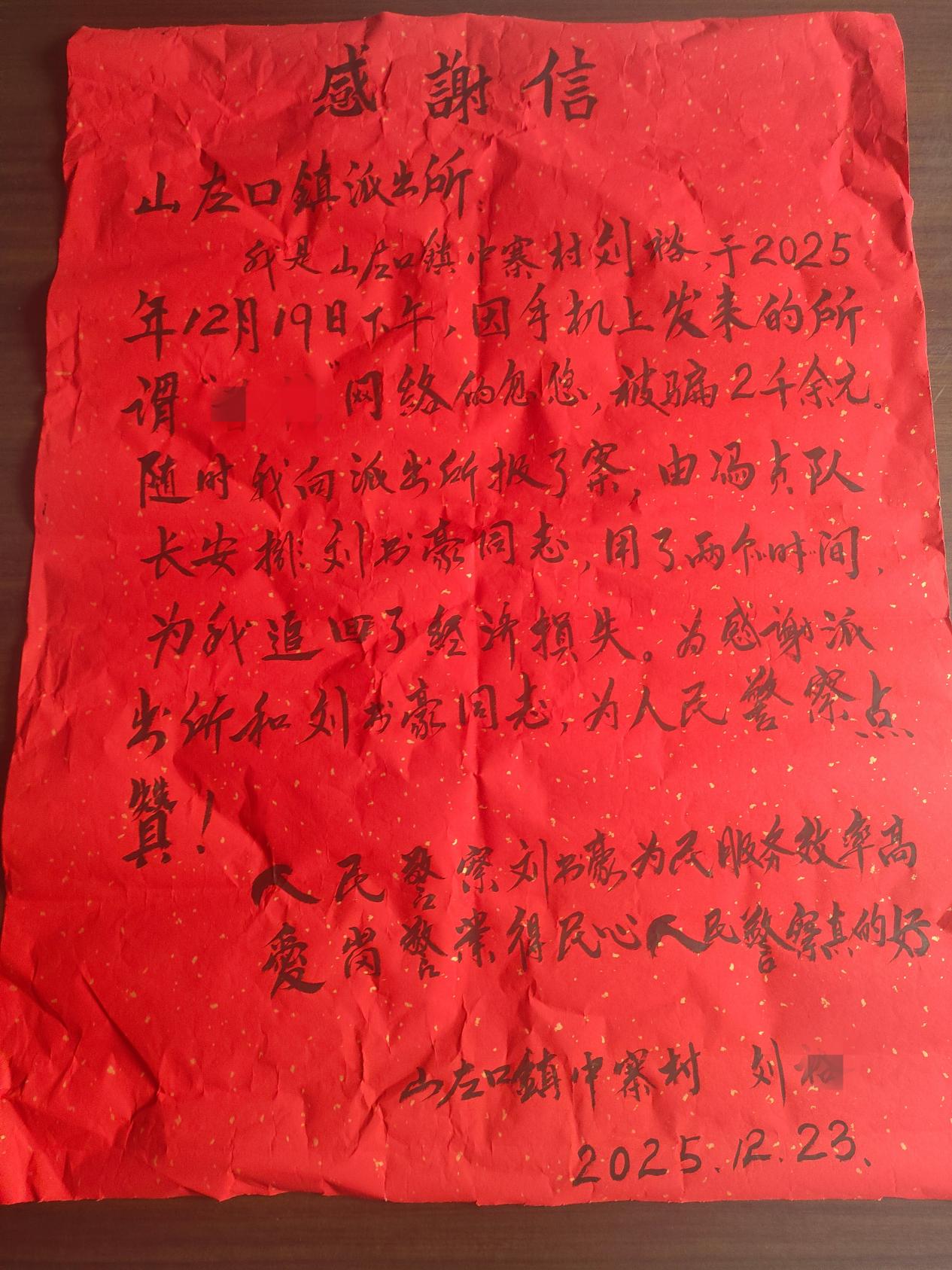 超大号感谢信和锦旗,不仅承载着群众对民警刘书豪个人的谢意,更是对山左口派出所用心用情解决群众急难愁盼问题的赞许。“新的一年,我将继续立足岗位,不断提升服务效能,切实守护好辖区群众的财产安全与合法权益,不负‘人民警察’的光荣称号。”(袁青青 孟梦)