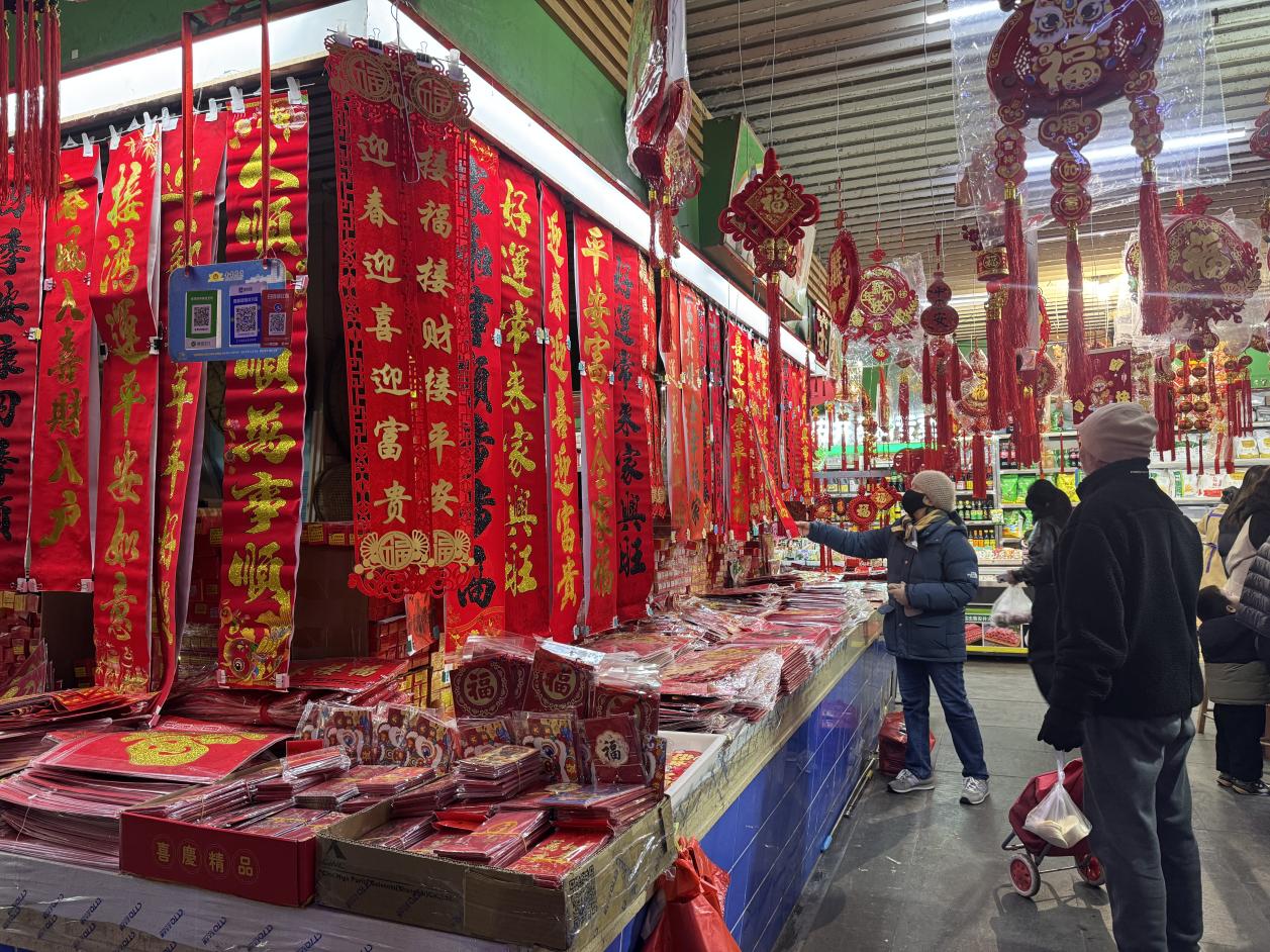 在海州区金宝农贸市场,春联摊位被喜庆的红色包裹,大红春联、烫金福字、精致窗花层层叠叠,吸引着市民驻足挑选。摊主们一边整理琳琅满目的年货,一边热情招呼顾客,各类新式春联格外走俏。春联商户张帆介绍,今年带胶和磁吸款春联深受青睐,胶款粘贴牢固且撕下不留痕迹,磁吸款操作便捷成年轻人首选,尤其是带有马年生肖元素的款式,销量十分可观。