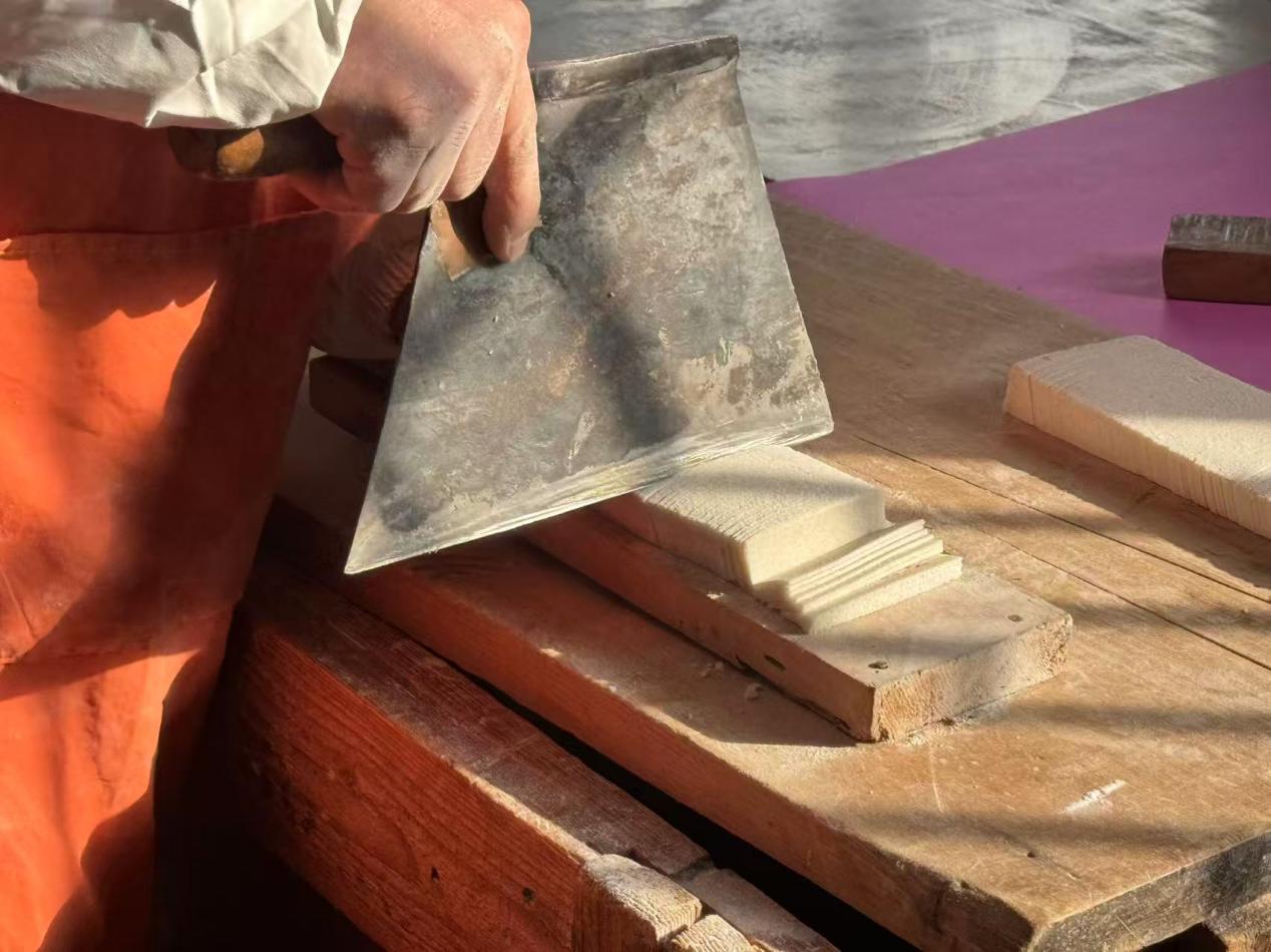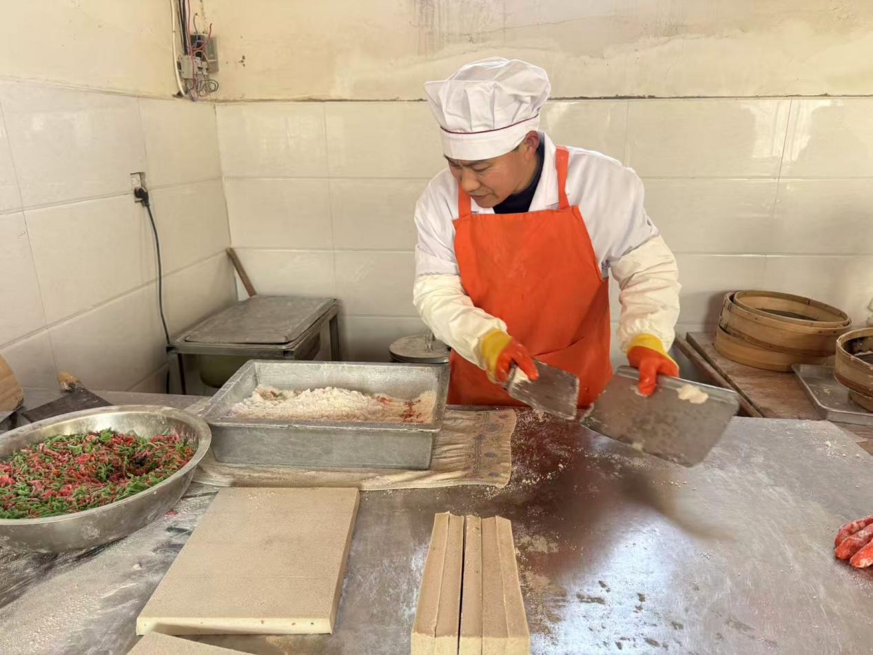 板浦庆丰大糕原名云片糕,因形似清代官员玉带,亦有“玉带糕”之称,其历史可追溯至乾隆初年。曹家祖先自山东迁至板浦,以做糕手艺扎根,历经九代,制作大糕的二十四道工序始终坚守纯手工完成,选米、泡米、磨浆、蒸煮、切片……每一个步骤都精益求精,只为保留最地道的老味道。“做糕的关键在选料精良,必须用上等好料,慢工出细活,老手艺做的东西才好吃。”曹俊成说,为保证品质,他每日按需制作,即便产量可达千八百条,也绝不因销量忽视工艺,从现在到年前,大糕始终供不应求,常常早早售罄。