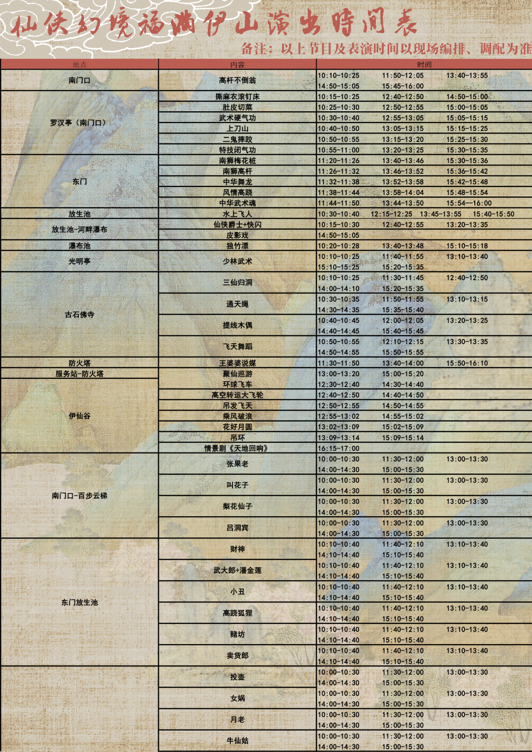 提线木偶、上刀山、独竹漂、高空叠椅、水上飞人等20个以上特色小型演艺项目,全天候循环演出;