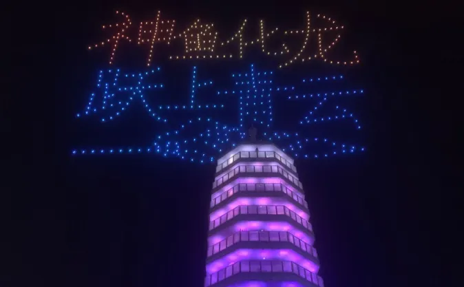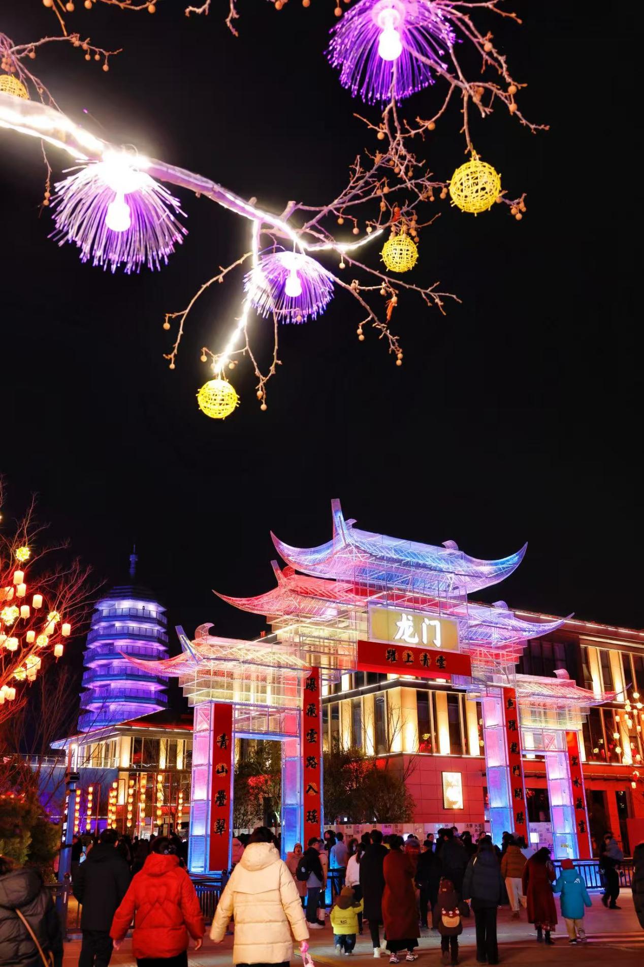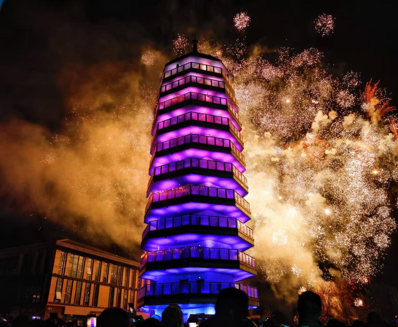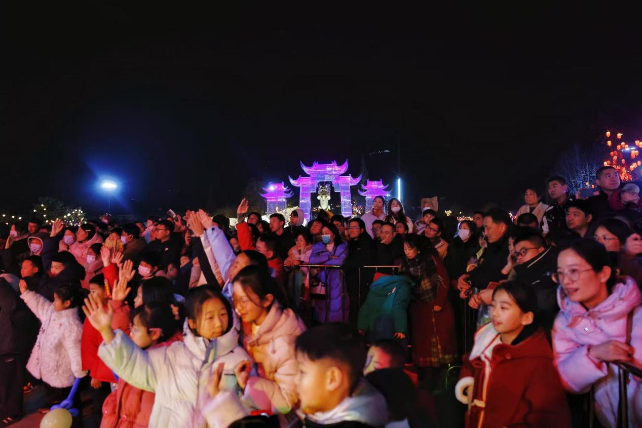 神鱼瑶塔璀璨夺目之下,焰火瀑布倾塔而下,瑶塔之下,福愿声声。万众祈愿仪式上,游人们纷纷挂上渔湾景区免费送出的福牌,将对新一年的美好期许系上;《龙马呈祥》祈福舞翩跹而起,星耀福塔的亮塔仪式与烟花秀,将“祥马献瑞”的美好寓意,写满渔湾的天际。无人机在渔湾欢乐城上空闪耀出“龙门”“神鱼化龙”“跃上青云”的图案和字样!令万千游客发出阵阵欢呼!