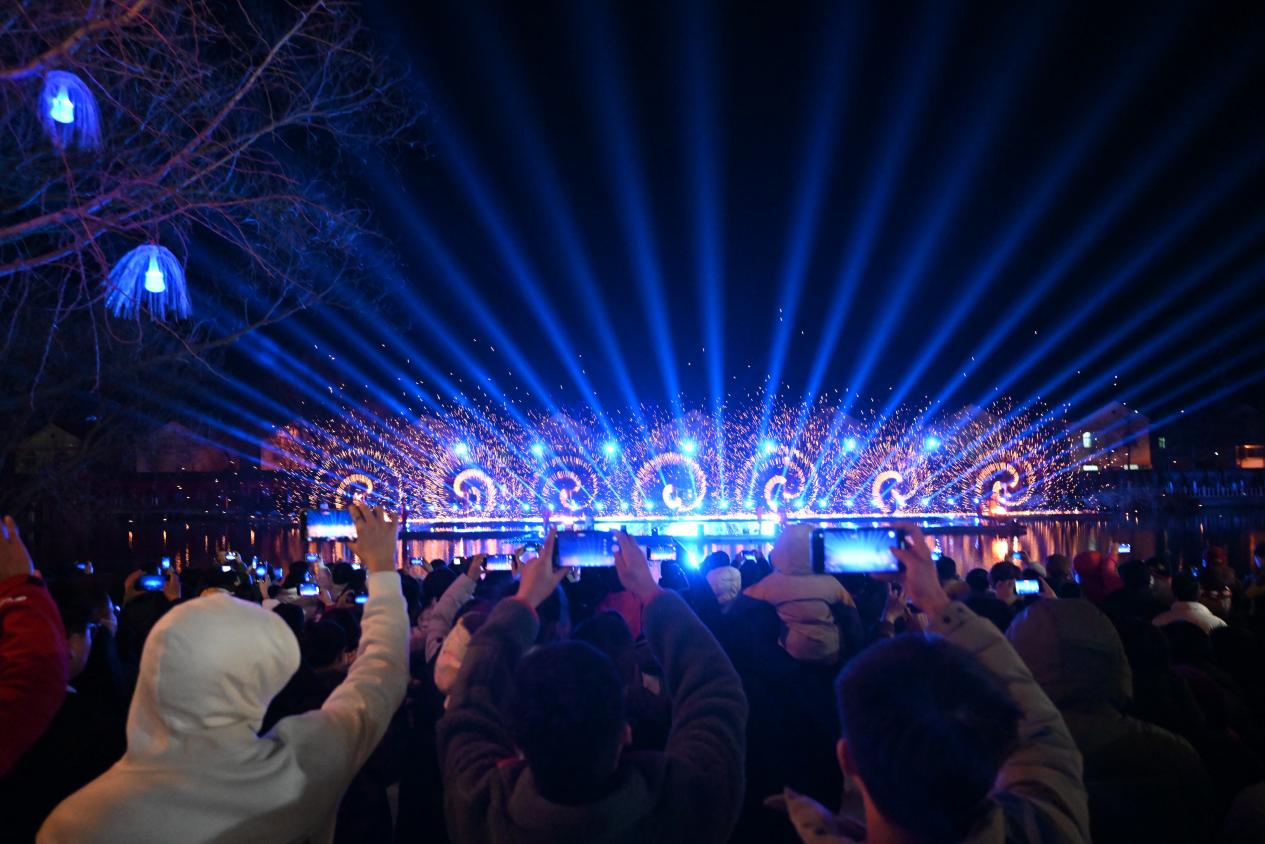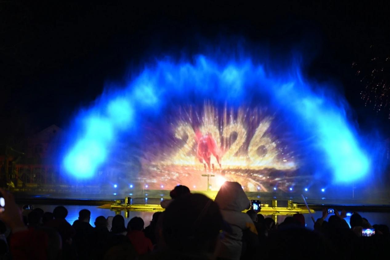 小游园水面舞台上,夜的高潮如约而至。《龙腾马跃》水幕舞随音乐起伏,祥马奔腾的光影在碧波上流转;《跃上青云》激光舞划破夜空,将“马到成功”的美好祈愿,化作满天星河。