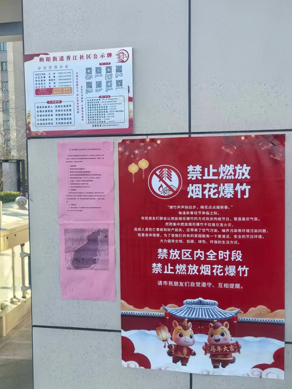 除了在关键节点和特殊事件上的精准发力,朐阳街道还指导物业公司将禁燃禁放宣传融入日常服务的点点滴滴。走进辖区各小区的物业服务中心,首先映入眼帘的便是张贴在中心门口、公告栏等醒目位置的禁燃禁放宣传海报。海报设计得喜庆又严肃,禁止燃放烟花爆竹的标语清晰可见,很有节日里的警示感。