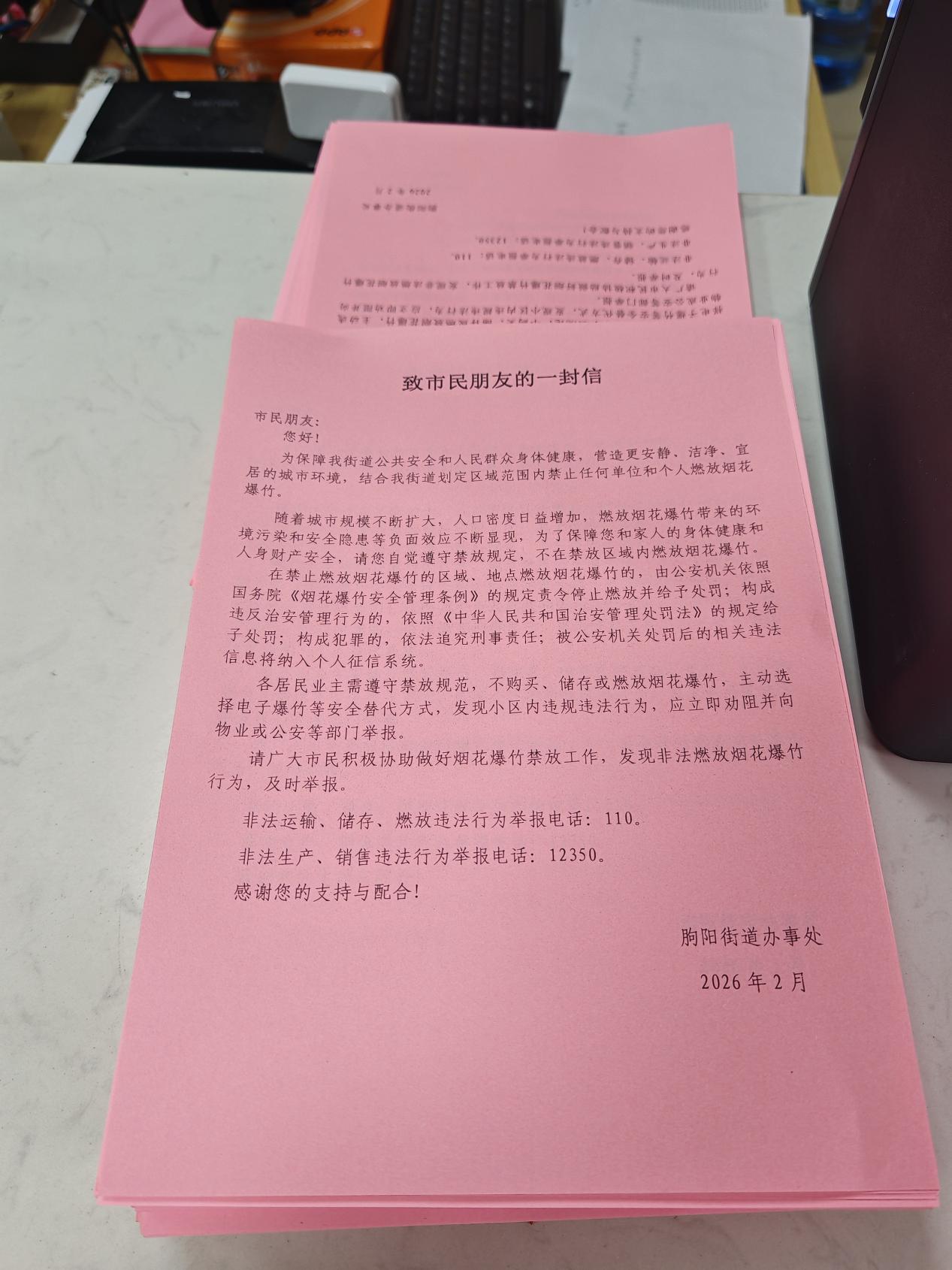 “阿姨,来交物业费啊?这是咱们的禁燃禁放致市民朋友的一封信,您带一份回去看看,也给家里人都讲讲。”在居民办理缴费、咨询等日常业务时,物业工作人员会顺手递上一份提醒信。这种“见缝插针”式的宣传,让居民在办理“家务事”的同时,也将“禁放规定”带回了家。不少居民表示:“物业这么反复提醒,也是为了我们大家好,现在小区里安静了,空气也好了,这个年过得确实更舒心。”