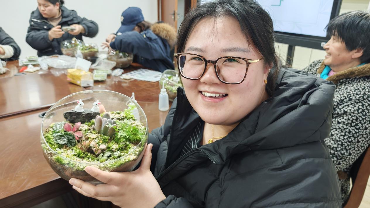 在手作环节,平日里忙于工作和生活的女同胞们变身“巧手花匠”,充分发挥丰富的想象力,手持小铲、镊子,将一片片苔藓、一株株网纹草、一颗颗彩色砂石小心翼翼地装进玻璃容器。填土、栽种、铺石、装饰……大家互相交流心得,现场气氛温馨而热烈。不一会儿,一个个妙趣横生、错落有致的微景观生态瓶便在手中诞生。这些小小的玻璃瓶,不仅承载着对春天的美好期盼,更寄托了大家对生活细微之处的热爱与期许。看着自己亲手制作的“微型花园”,居民张阿姨开心地表示:“这个活动非常治愈,把这一抹绿色捧在手里,感觉心情都变美了,我们要像照顾这些小生命一样,热爱生活,绽放属于自己的芳华。”
