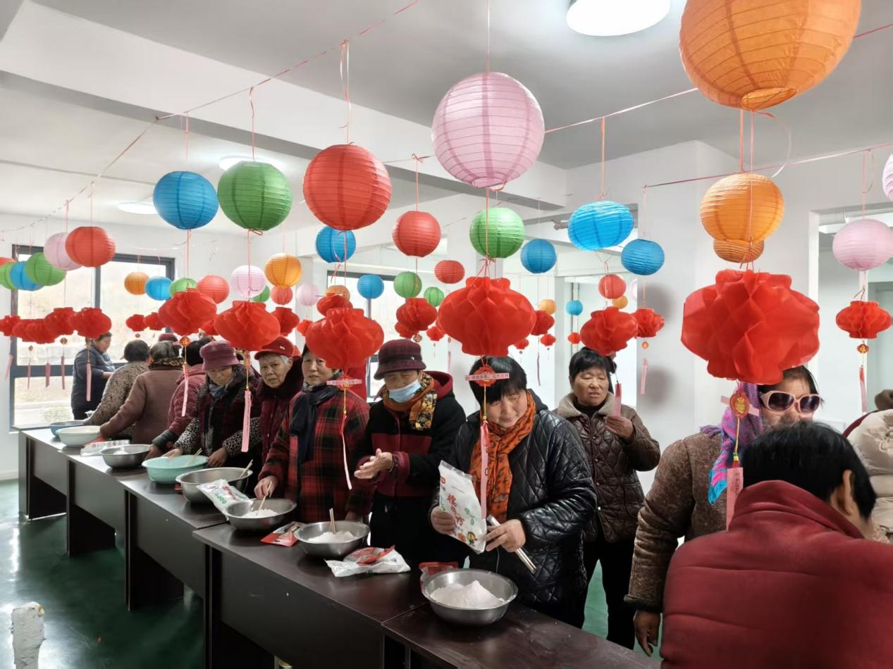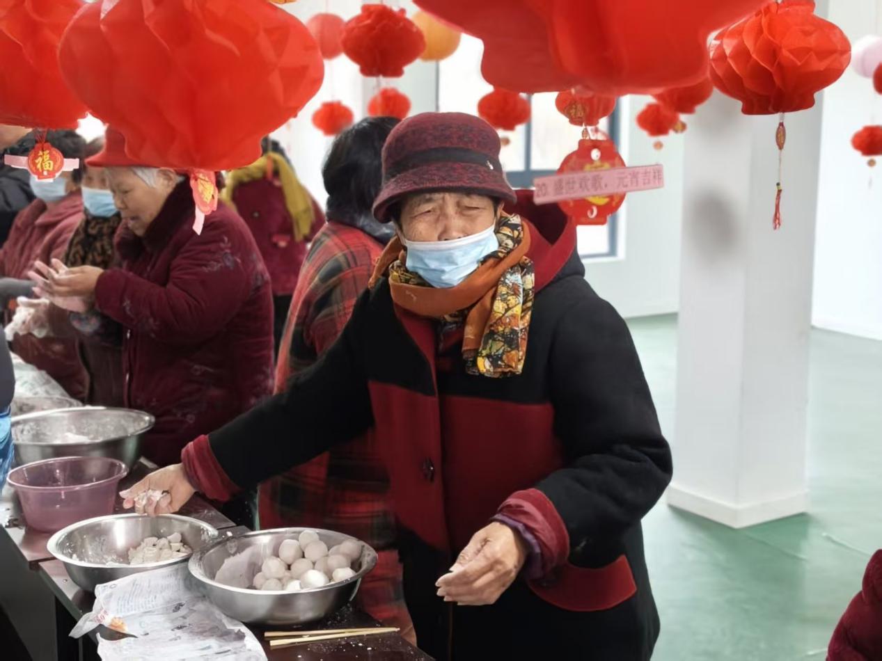 活动伊始就是重头戏——包汤圆。糯米粉、香甜馅料等材料早已准备就绪。在志愿者的引导下,大家围坐在一起,揉面、包馅、搓圆……一双双巧手上下翻飞。村民们携手协作、互相帮忙,雪白的面团在掌心翻转揉捏,一个个圆润饱满的汤圆很快摆满餐盘。大家一边动手制作,一边拉家常、话团圆,小小的汤圆凝聚了浓浓的邻里情。
