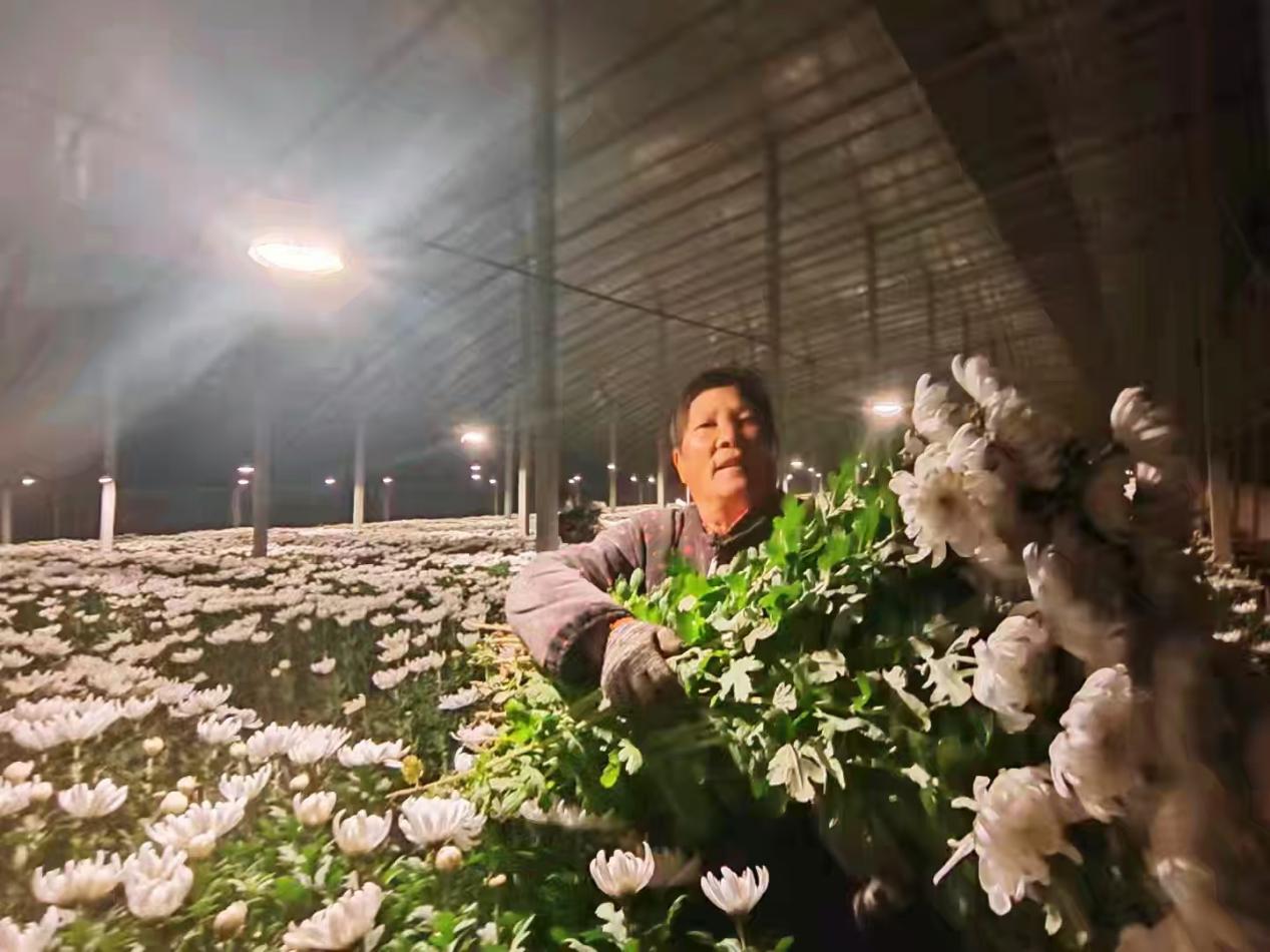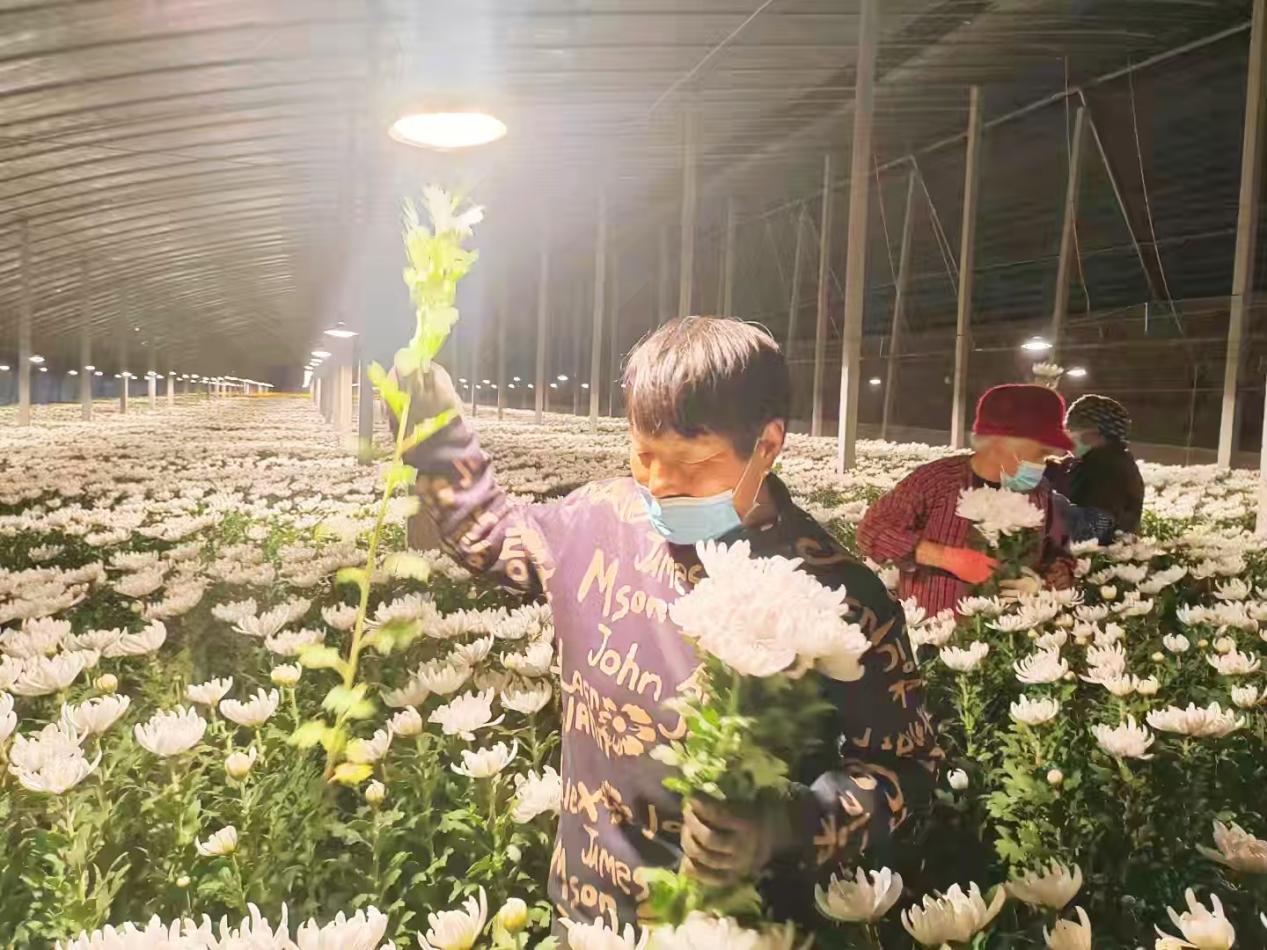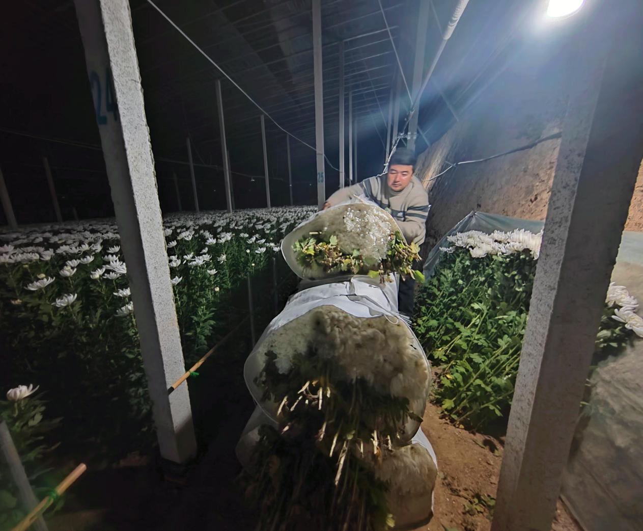 多日的阴雨低温过后,天气放晴,温度升高,大棚黄白菊沐浴和煦的春风,竞相怒放,金黄与洁白交织,灯光映衬下别样美丽。花农们不负这大好春光,采摘、搬运、包装忙而有序,每个人的脸上都洋溢着丰收的喜悦。