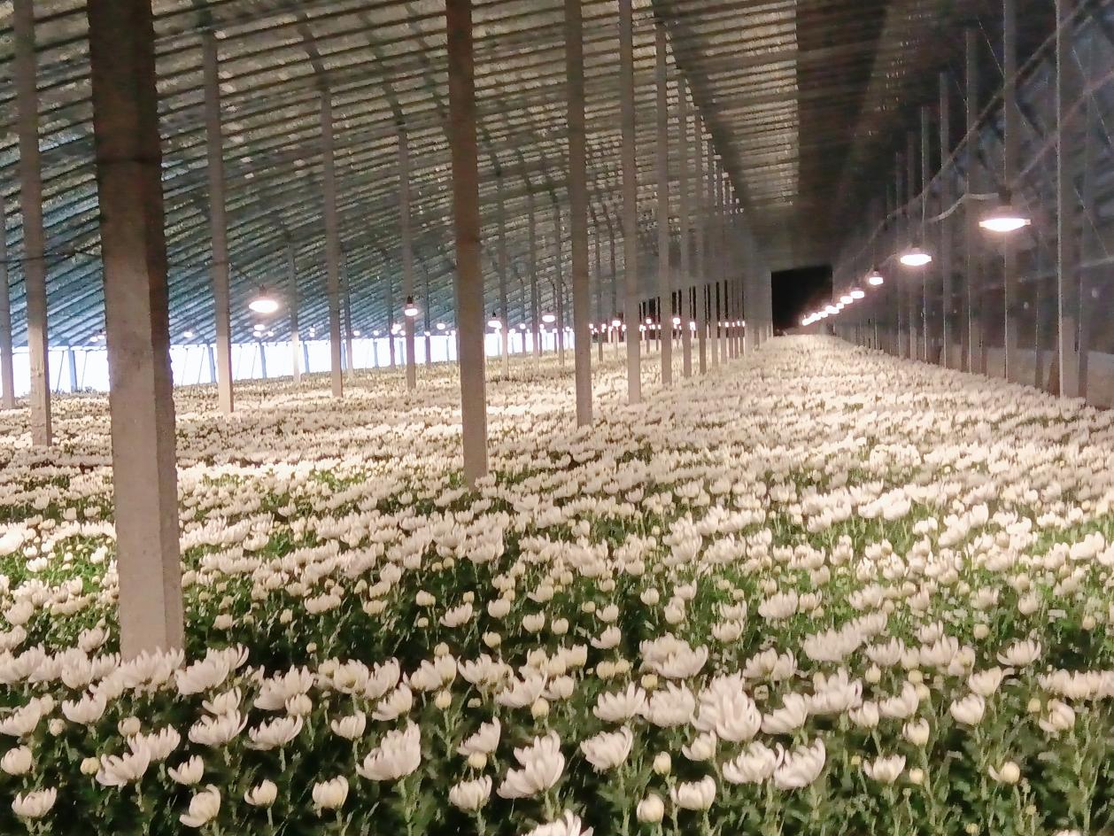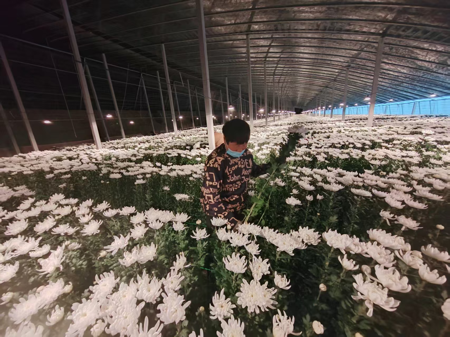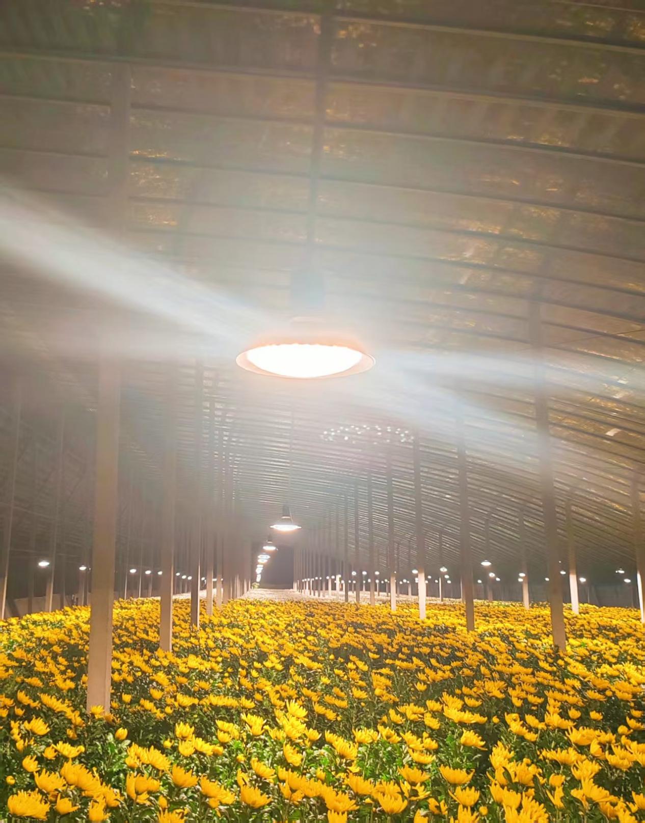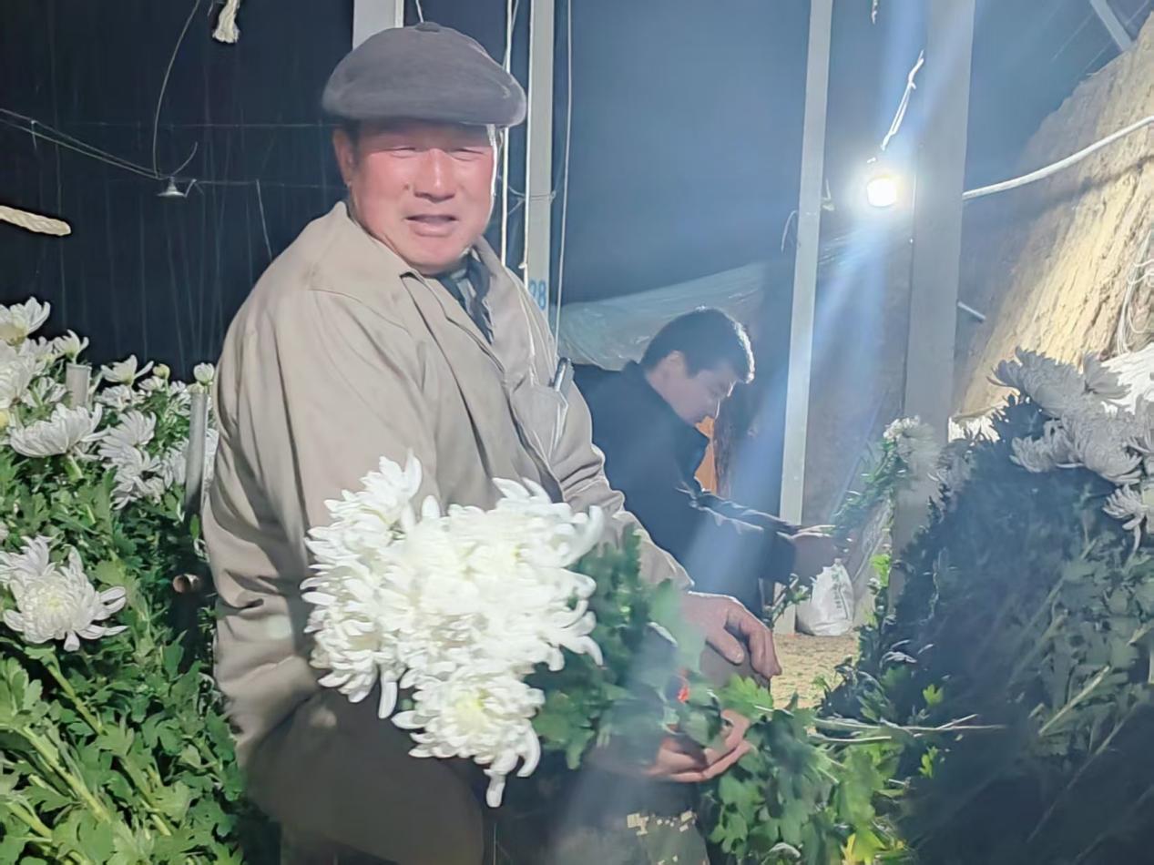 多日的阴雨低温过后,天气放晴,温度升高,大棚黄白菊沐浴和煦的春风,竞相怒放,金黄与洁白交织,灯光映衬下别样美丽。花农们不负这大好春光,采摘、搬运、包装忙而有序,每个人的脸上都洋溢着丰收的喜悦。