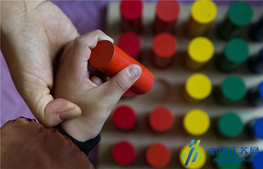 2019年2月13日,江苏连云港市连云区博爱康复中心康复师李丹以“种草莓”游戏手把手教脑瘫孩子上肢精细运动训练。