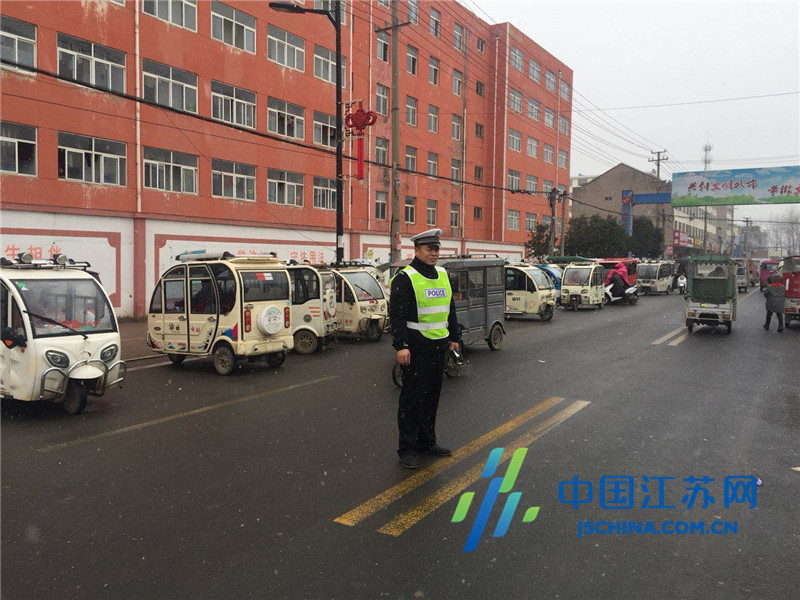 交警雪中维护校门口道路交通安全。