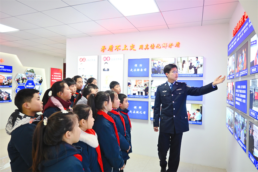 民警热情接待了这批特殊的“小客人”,带领他们相继参观了值班室、综合指挥室、装备室等场所,并细致介绍了警务站日常工作,为他们展示了单警装备的使用方法和用途。