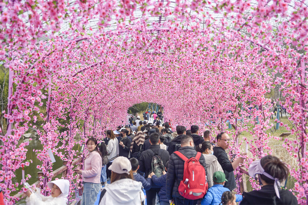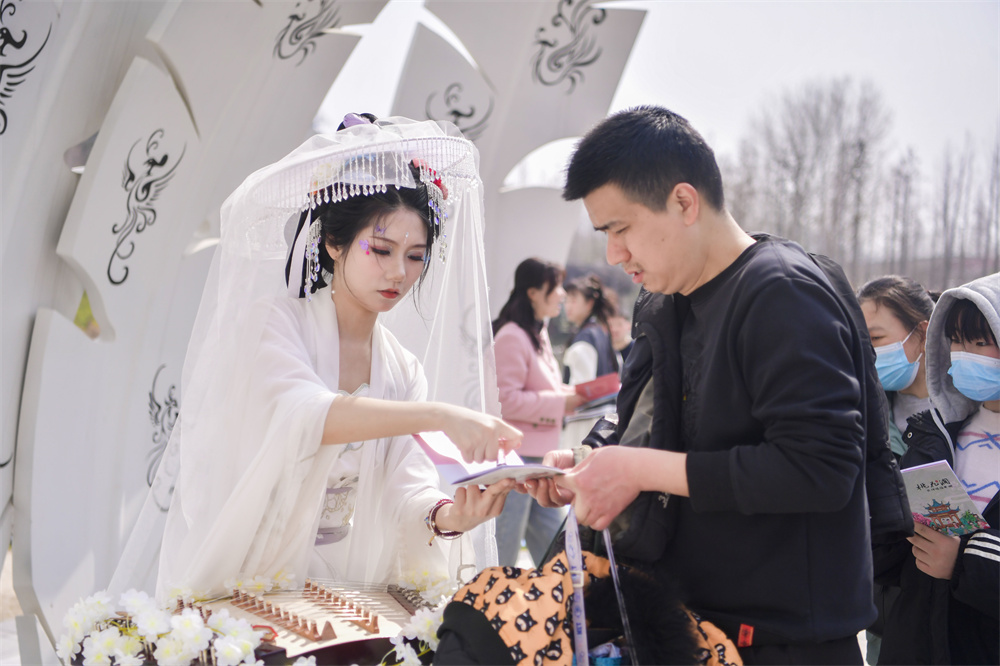 有人剪花添春意,有人簪花赏春景,有人赠花表心意,桃花涧景区作为本次旅游嘉年华盛会的主会场,围绕沉浸式游园体验推出“花神NPC互动巡游”,衣袂飘飘踏春而来,不少游客和汉服爱好者纷纷加入其中,一起巡游迎春,完成互动游戏集赐福印章。围绕创意与科技的浪漫结合推出“无人机表白”、新奇与便捷的创新服务打造“飞行餐厅”,还有萌宠喂养、涧龙园戏水、摔碗酒、租赁汉服免费游园等一系列活动。