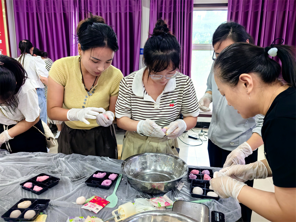 二楼文体中心内,村民们齐聚一堂,自己动手制作月饼。大家分工协作,配合默契,揉面、包馅、压模,很快一个月饼就成型了,大家一边制作月饼,一边唠家常,了解中秋传统文化,共庆幸福团圆节。不一会儿,在一双双巧手制作下,一个个五颜六色、晶莹剔透的冰皮月饼新鲜出炉,印着移风易俗宣传语赋予这些月饼新的文化内涵,“孝行千里”“月满墩尚”“敦厚同堂”“尚善之家”等简短的宣传语,提醒着村民们破除陋习、勤俭持家,推进移风易俗深入人心,大家纷纷拿出手机记录下这美好时刻。“看着自己制作的冰皮月饼,非常有成就感,和大家一起动手制作月饼的过程,让我感受到满满的心意和浓浓的中秋氛围。”刘湾村宋小影说。