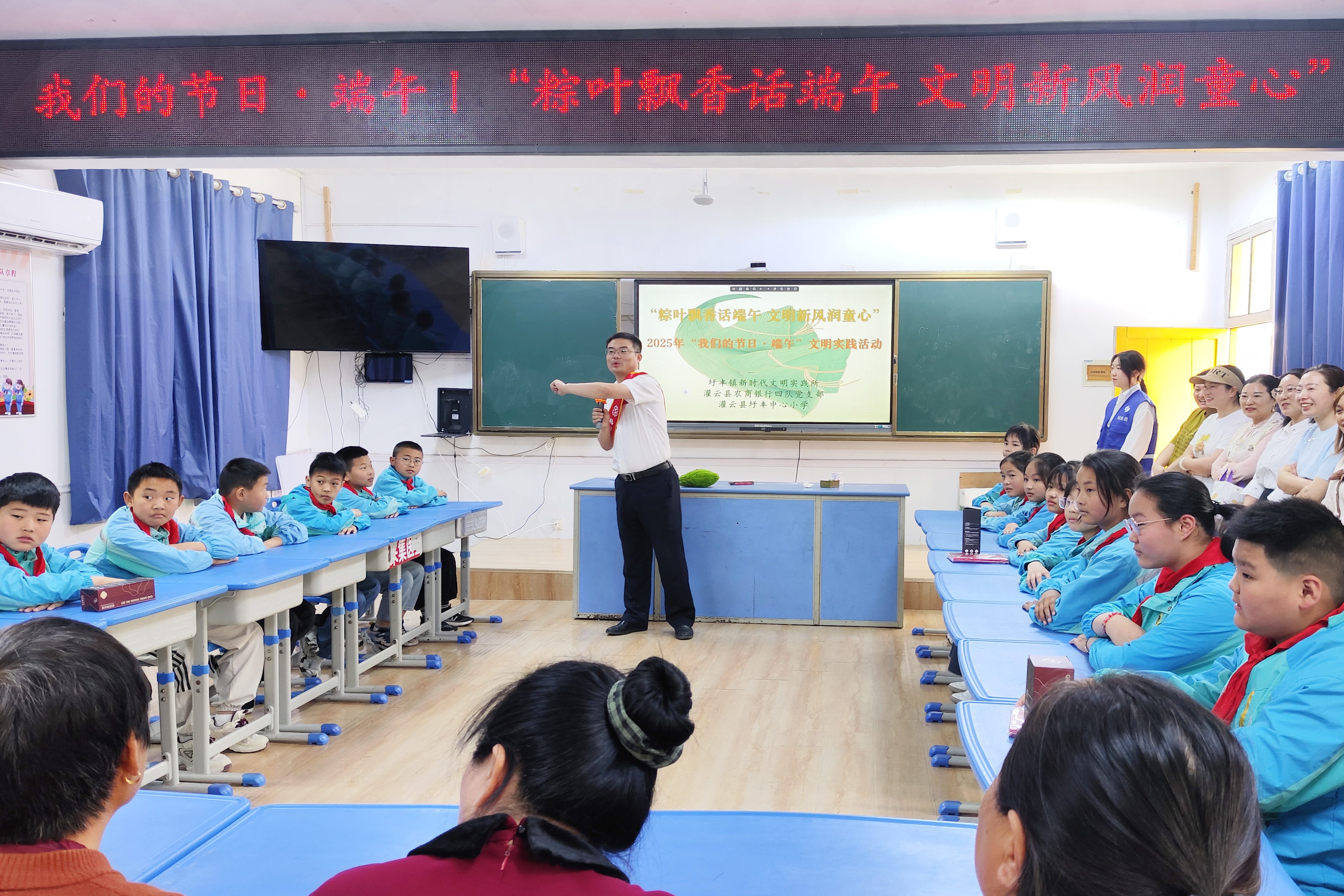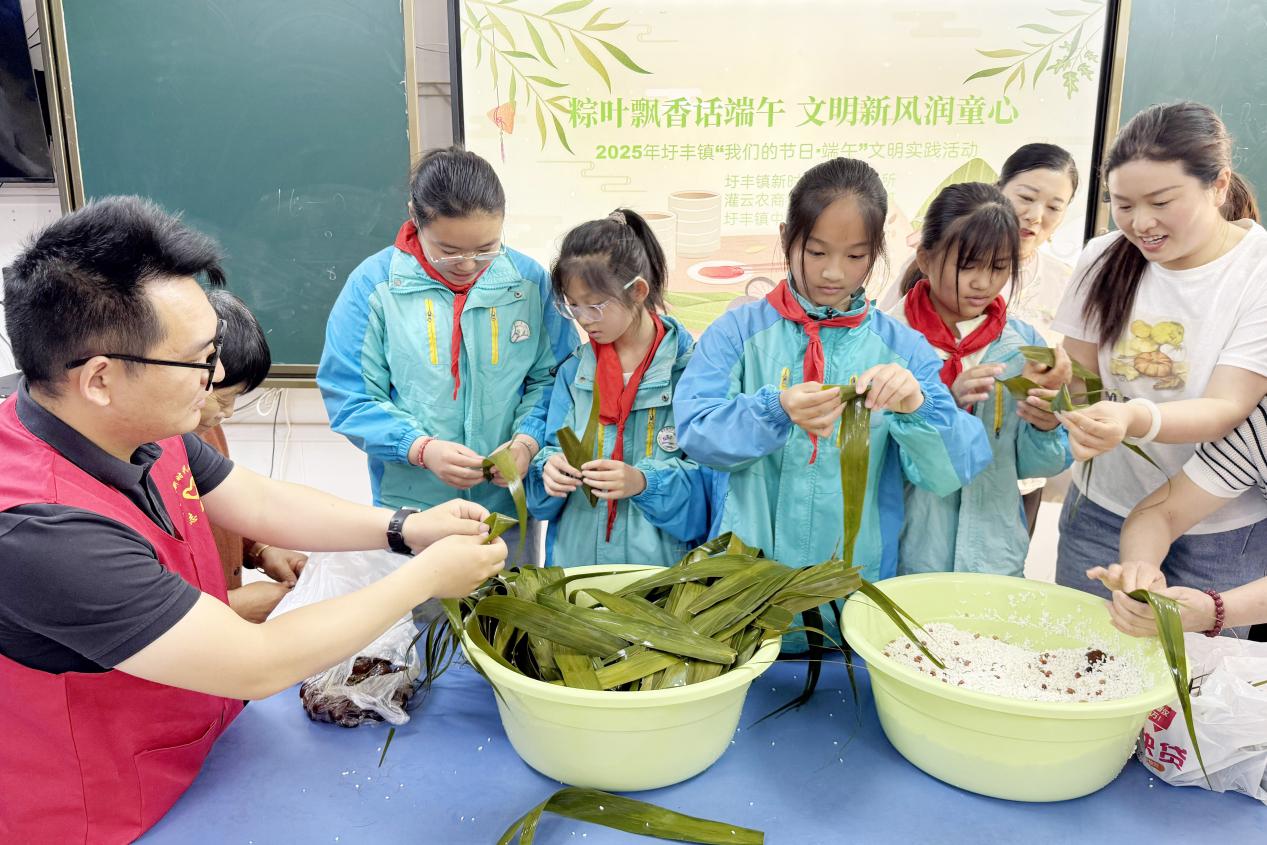 中国江苏网5月27日连云港讯 五月五,过端午,粽叶青,糯米香……5月26日,由灌云县圩丰镇新时代文明实践所、灌云农商银行四队党支部、圩丰镇中心小学联合举办的“粽叶飘香话端午 文明新风润童心”迎端午主题活动在该镇中心小学举行,孩子们在丰富多彩的体验中,感受着传统文化的独特魅力。