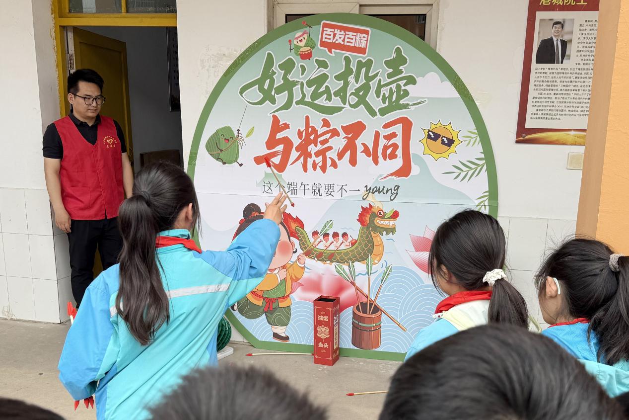 活动伊始,主持人为学生们介绍端午节的起源与习俗。并开展了端午知识问答有奖活动,获得同学们的热烈反响。在互动中,大家不仅了解到端午节的历史渊源,更对古人的智慧与文化传承有了新的认识。在民俗活动“投壶”游戏间隙,志愿者们向同学们介绍了包粽子、赛龙舟等传统习俗,让大家对这一传统节日有了更深入了解。同学们感慨地说:“以前只知道端午节吃粽子、挂香包,今天通过志愿者的讲解,才知道背后还有这么多深厚的文化内涵,这样的活动太有意义了!”
