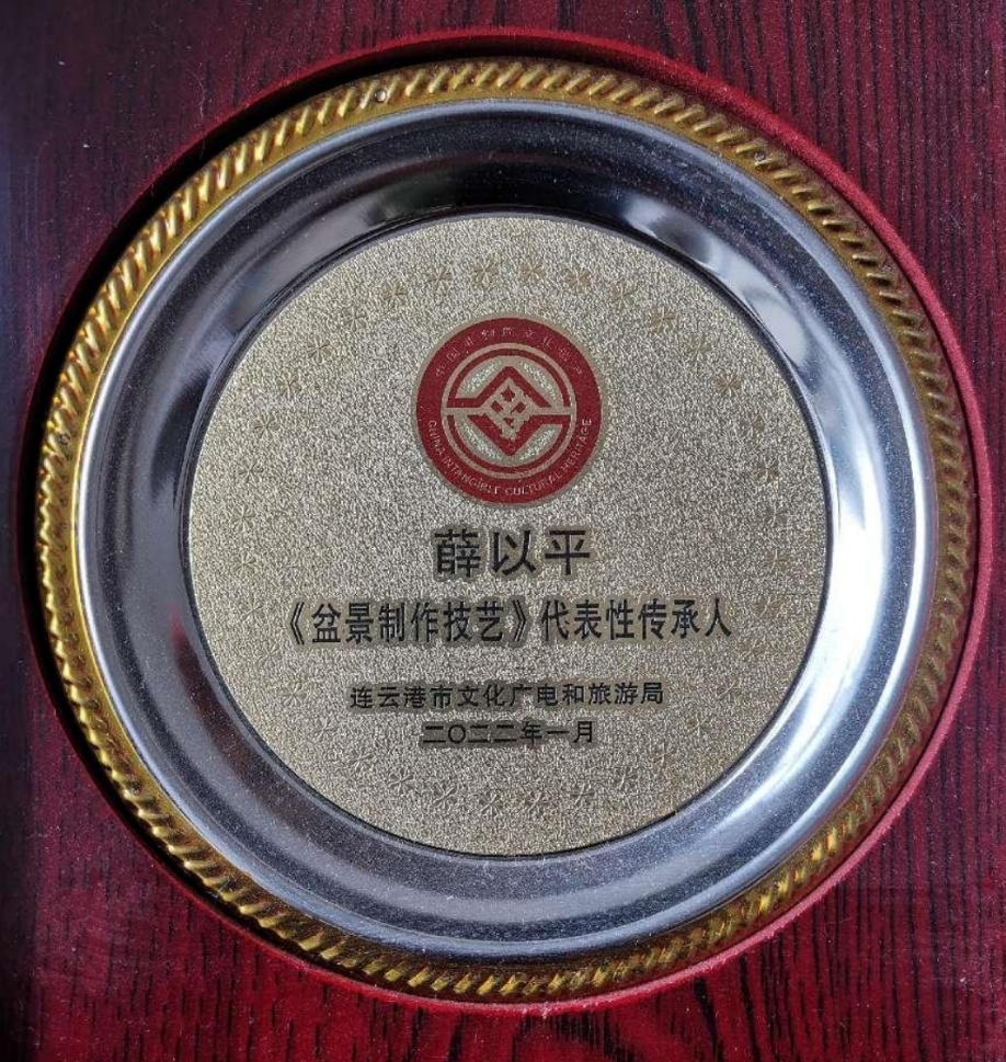 2021年12月,薛以平盆景艺术被连云港市人民政府列为连云港市非物质文化遗产代表性项目,他本人也被批准为代表性传承人。2021年9月,他被连云港市人才工作领导小组及连云港市人社局联合授予“连云港市‘金镶玉竹’乡土人才工作室领办人”荣誉称号。